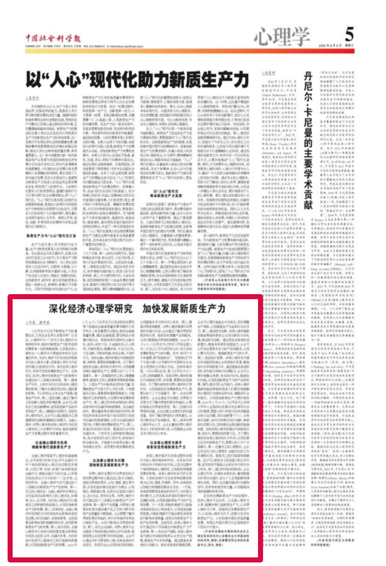 习近平总书记关于新质生产力的重要论述,引发社会各界尤其是学界广泛关注。心理学作为一门研究人类心理及行为规律的科学,能够对新质生产力的形成和发展带来一定的积极影响,尤其是经济心理学这一心理学分支更能够发挥举足轻重的作用。经济心理学不仅关注经济现象背后的心理学元素,还强调人类行为与经济环境之间的相互作用。深化经济心理学研究,有助于加快发展新质生产力。