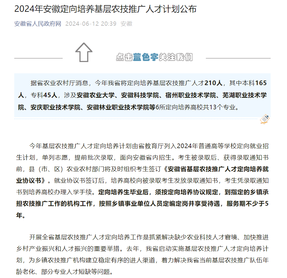 安徽省基层农技推广人才定向培养招生各项事宜,以省农业农村厅、教育厅有关文件通知为准。相关招生招生计划、政策在安徽省人民政府及各地公众号也将陆续推出。