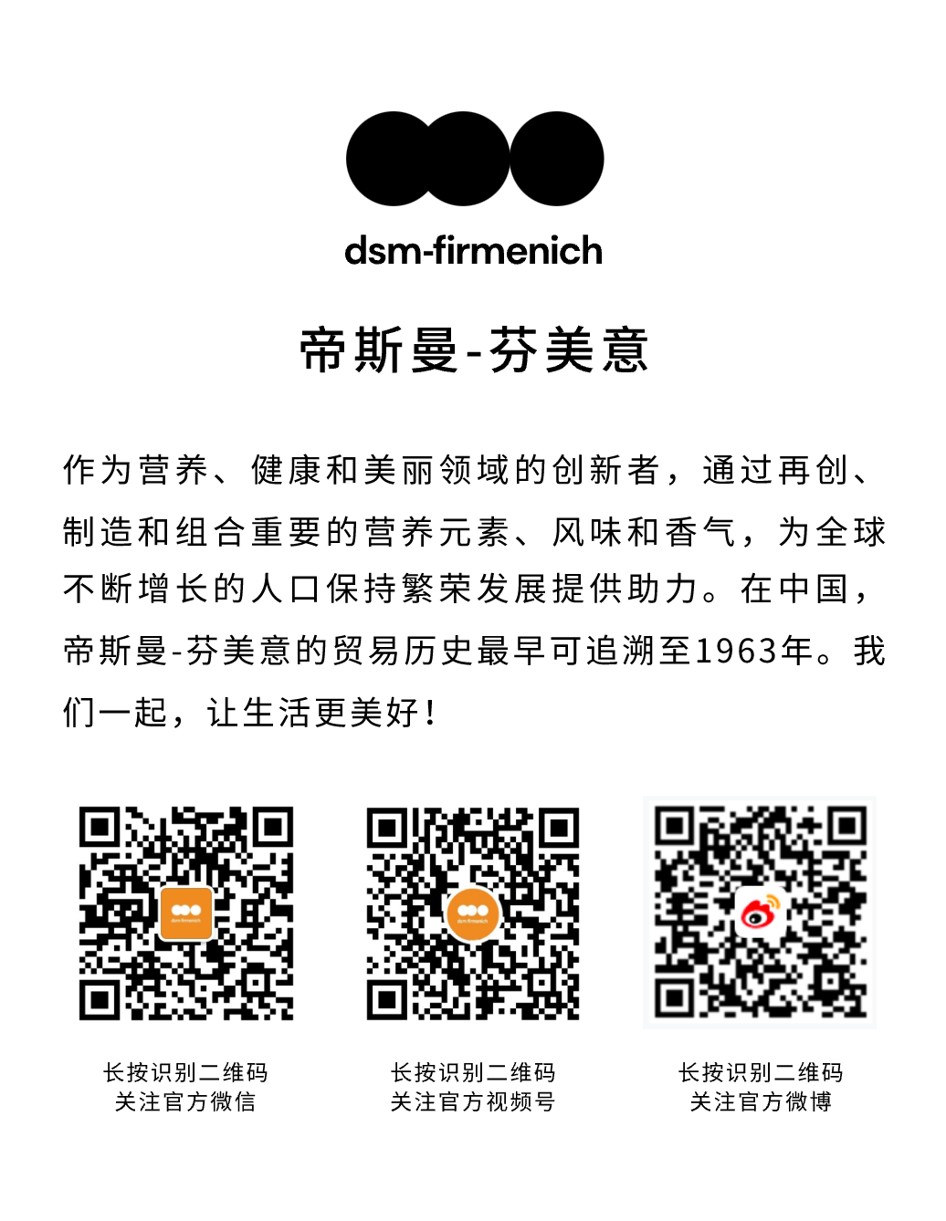 在深耕中国市场的旅程中,帝斯曼-芬美意始终秉承“我们让生活更美好”的使命,依托公司在营养、健康和美丽领域的专业知识和历史积淀,继续携手本土合作伙伴不断提升中国国民的美好生活福祉,在华践行“优秀企业公民”承诺。