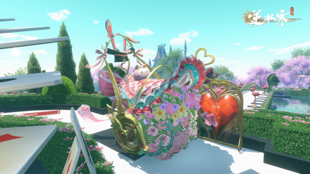 载具【奇想乡·花球车】带着满车鲜花滚动而来,各位同门可以乘坐其间,纵情游览。