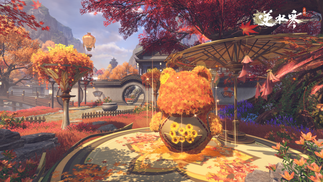 而庄园的【秋声系列组件】,则为各位同门搭建了一个秋日童话,它如同想象中的一样美丽——层林尽染、举目金黄;小院之中还有落叶叠成的可爱小熊,欢迎着每一位好友。