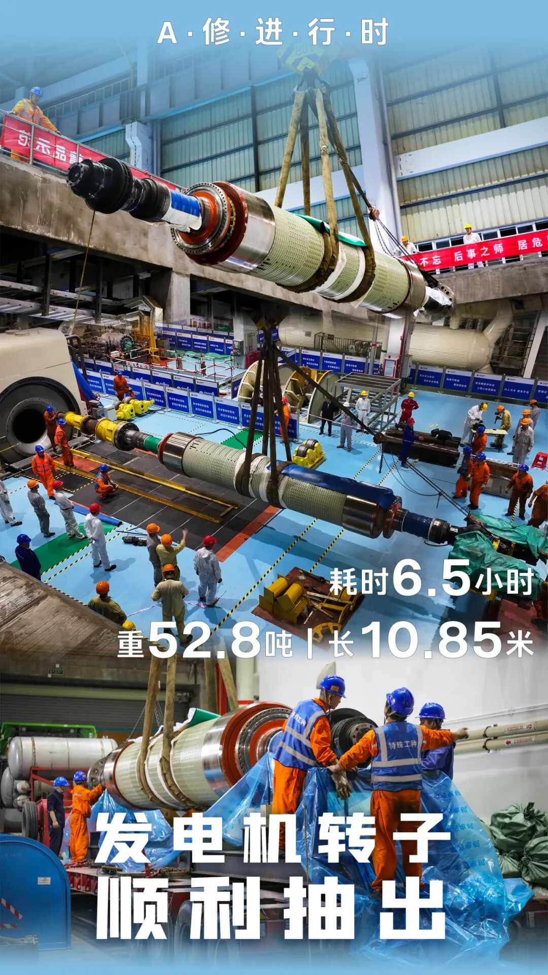 经过6.5小时连续作业,重52.8吨、长10.85米的发电机转子顺利从发电机定子膛内抽出,平稳放置到专用运输车上,吊装过程中未发生刮擦、受损情况。此次发电机抽转子工作成功完成,为转子完成升级改造,A级检修高质量完成提供坚实保障。