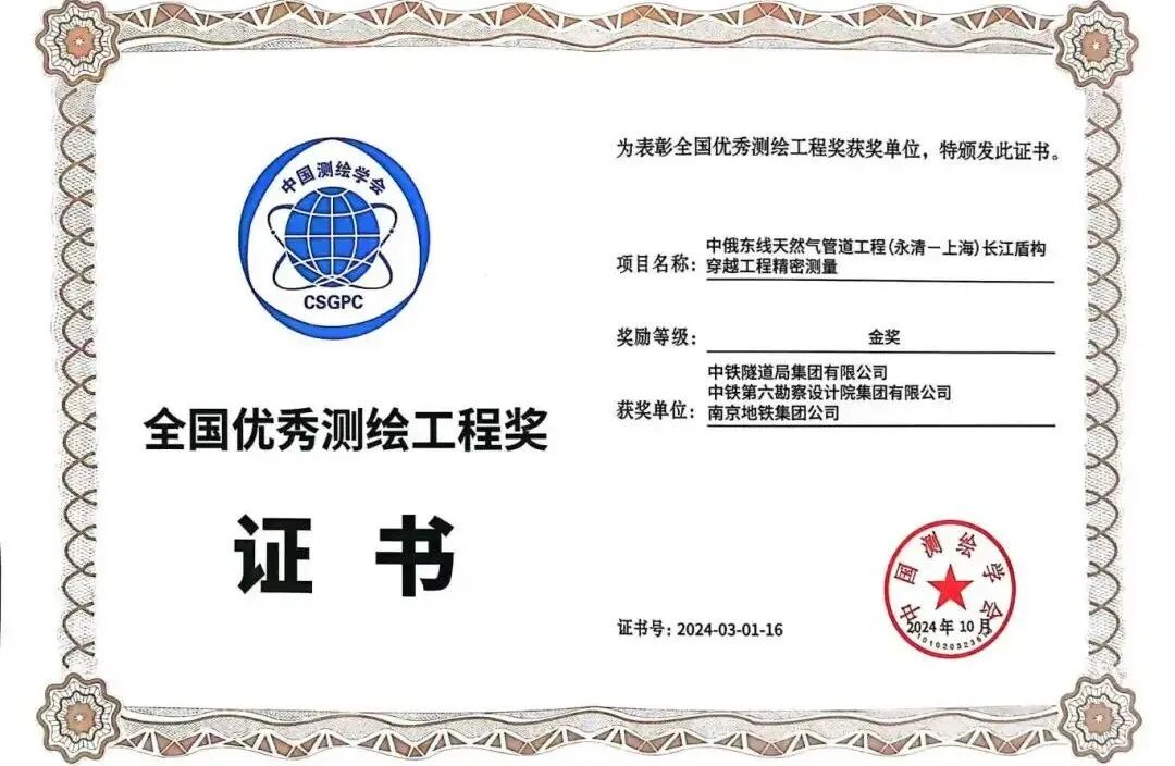 10月16日至17日,2024中国测绘地理信息科学技术年会在河南郑州召开。会上,中国工程院院士陈军宣读了全国优秀测绘工程奖、全国测绘地理信息科技创新型优秀单位等奖项,中铁隧道局凭借在“中俄东线天然气管道工程(永清-上海)长江盾构穿越工程精密测量”项目中的卓越表现,荣获2024年全国优秀测绘工程奖金奖,并荣获2024年全国测绘地理信息科技创新型优秀单位,这是中铁隧道局首次获得该类奖项和优秀单位。