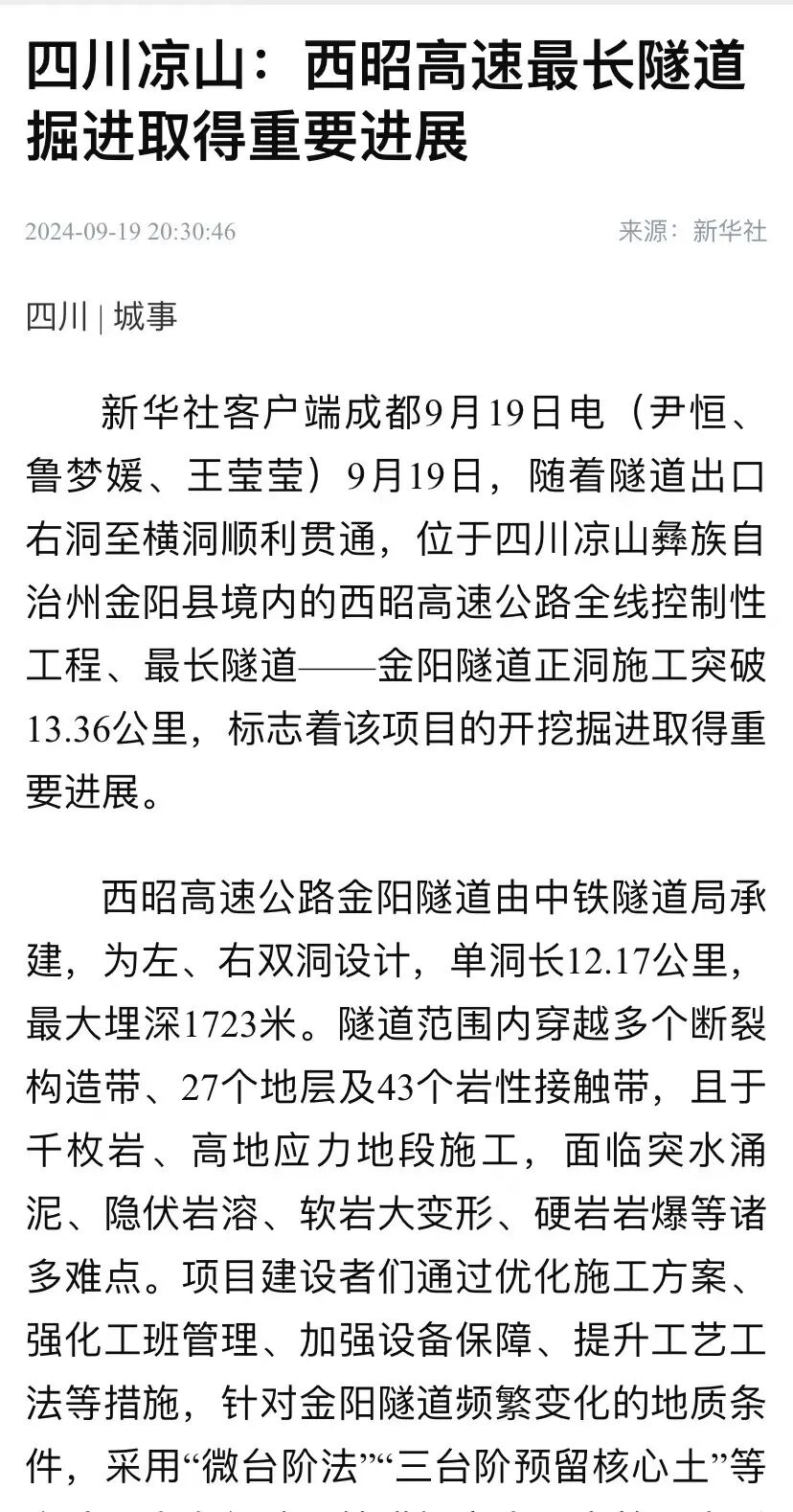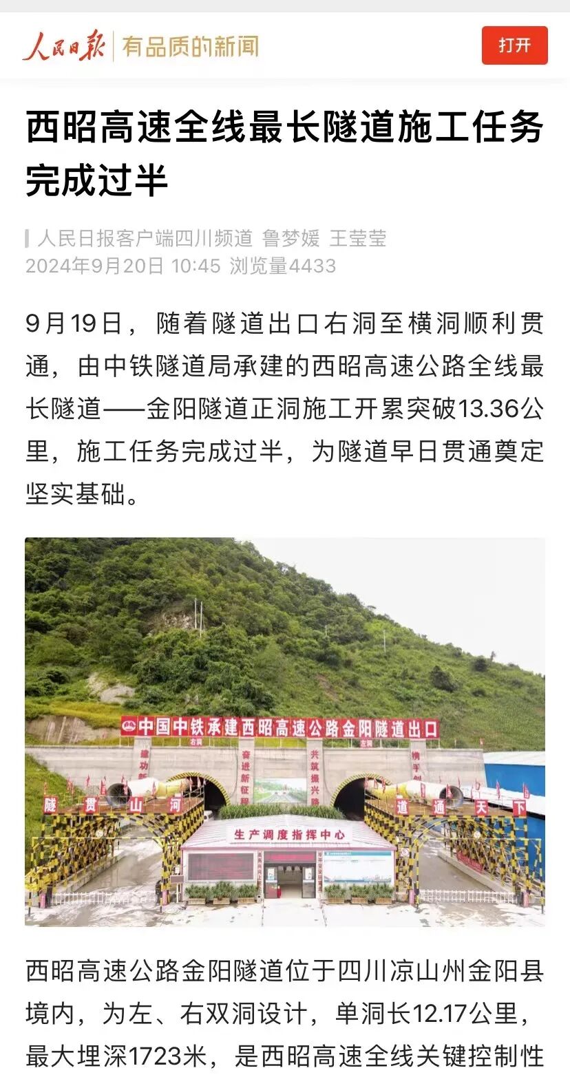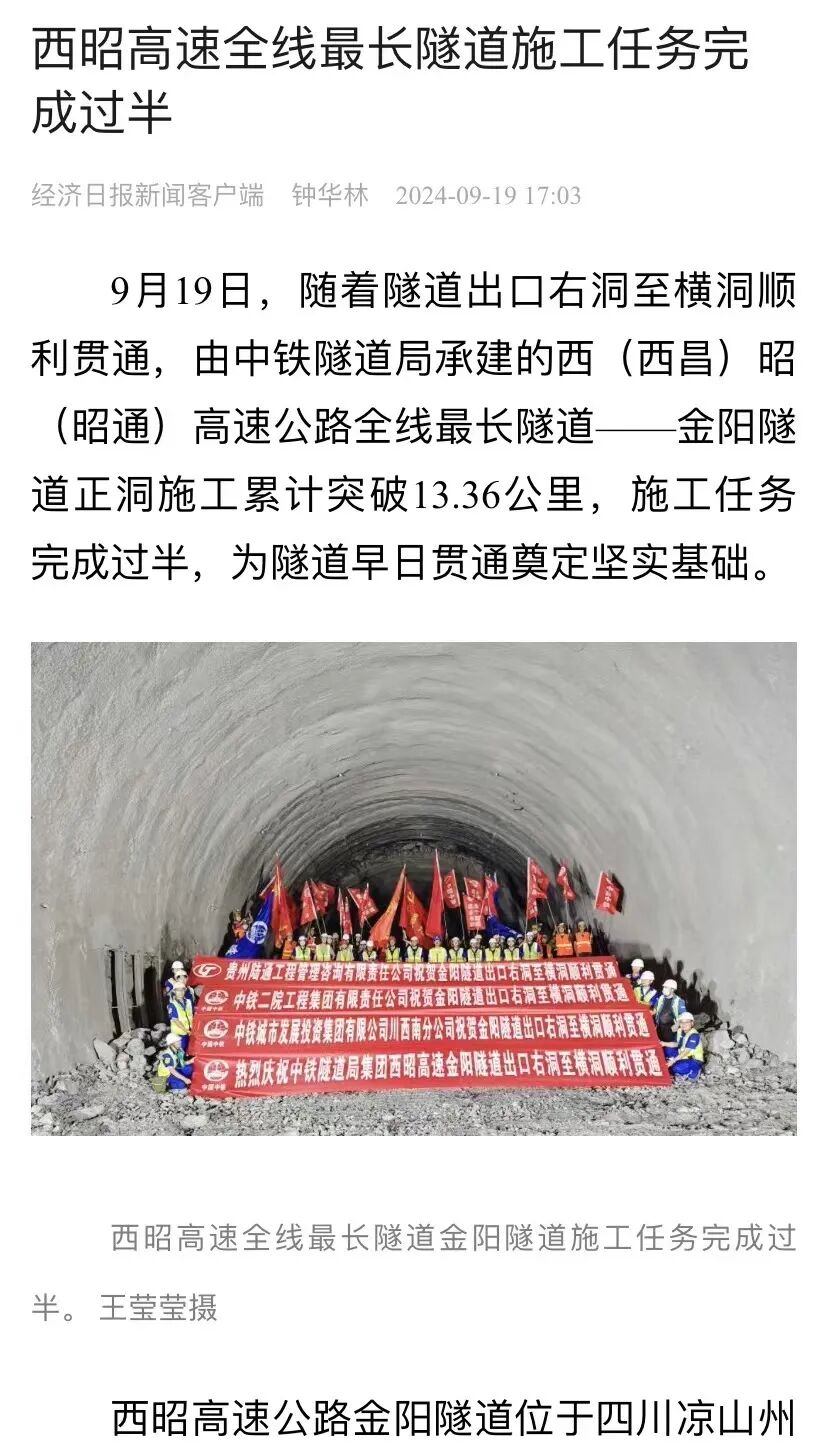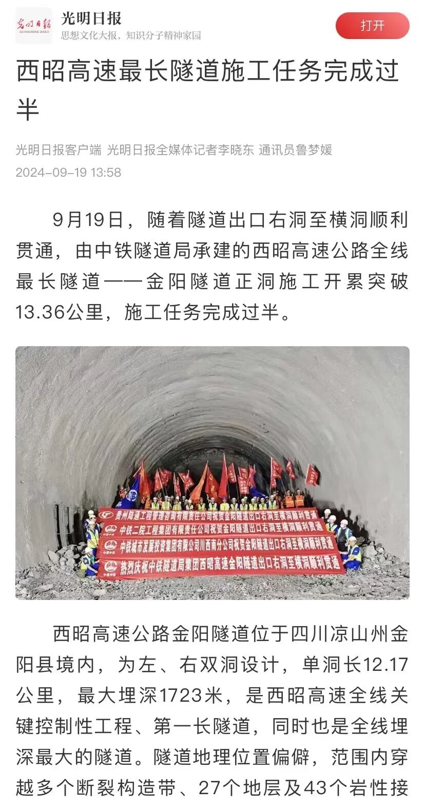 9月19日,由中铁隧道局施工的西昭高速公路全线最长隧道——金阳隧道出口右洞至横洞贯通,为西昭高速全线贯通提供了有力保障。人民日报、新华社、光明日报、经济日报对此聚焦报道。