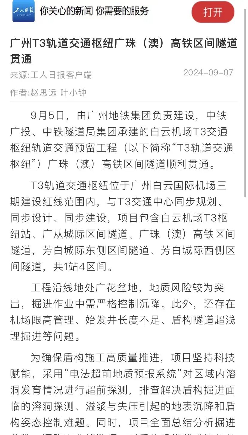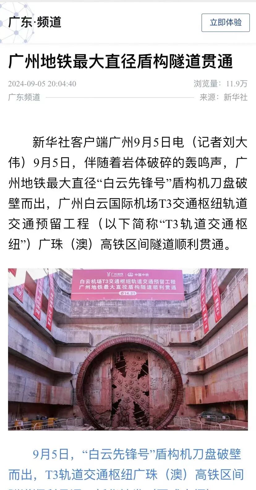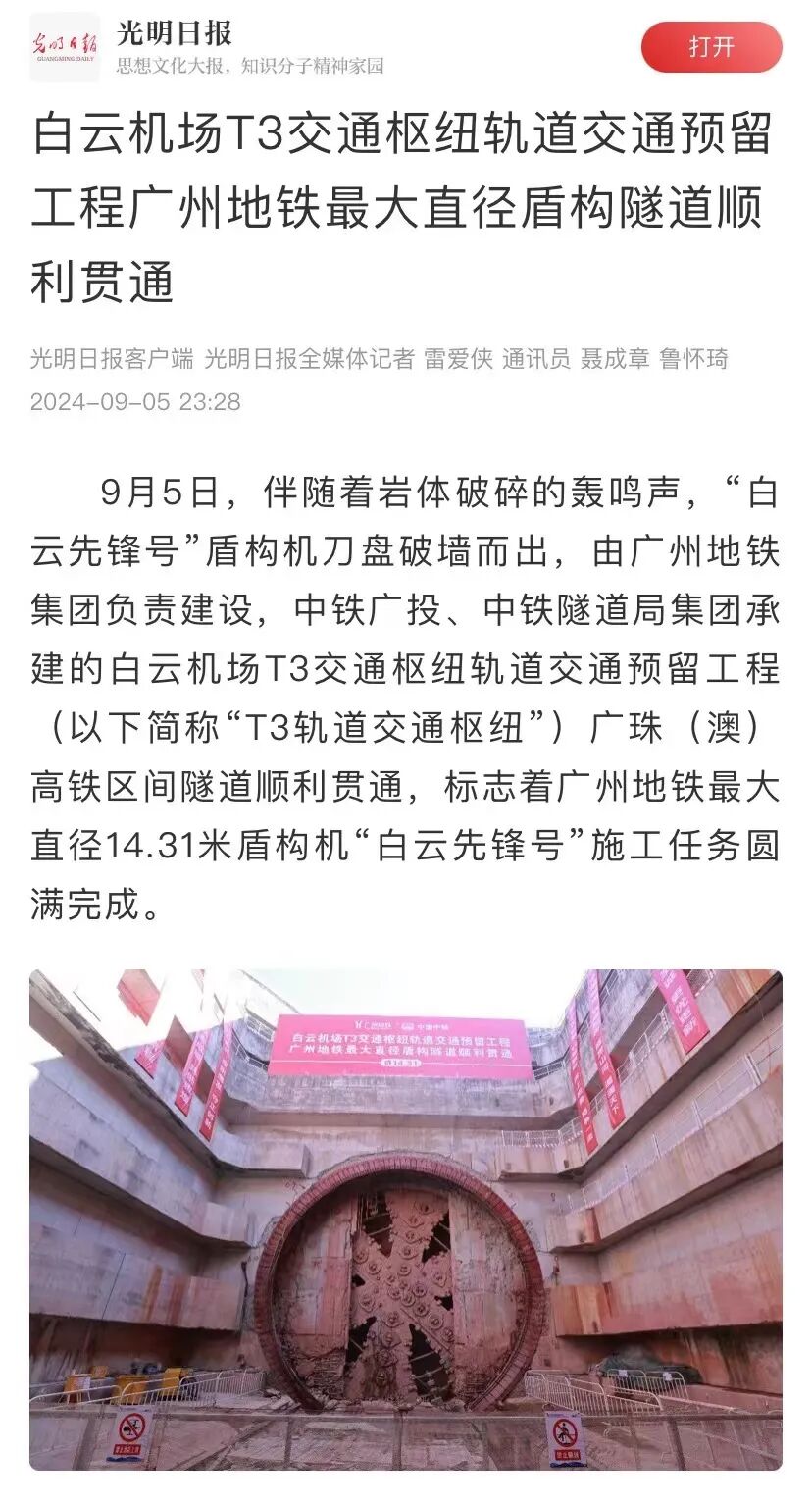 9月5日,由中铁隧道局施工的广州白云机场T3交通枢纽轨道交通预留工程广珠(澳)高铁区间隧道顺利贯通。新华社、光明日报、工人日报、中国新闻网对此聚焦报道。
