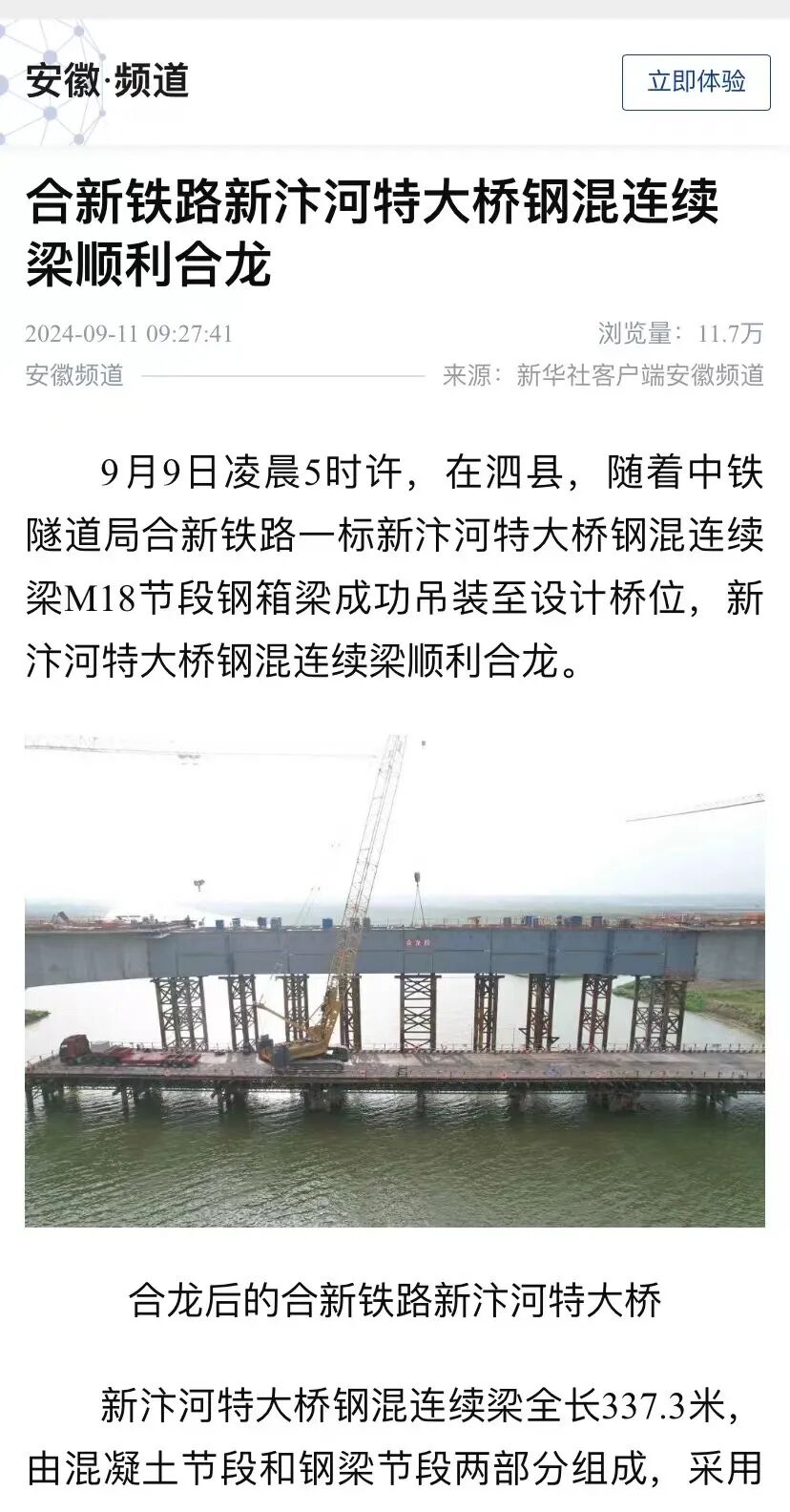 9月9日,由中铁隧道局施工的合新铁路一标新汴河特大桥钢混连续梁M18节段钢箱梁成功吊装至设计桥位,新汴河特大桥钢混连续梁顺利合龙。新华社对此聚焦报道。