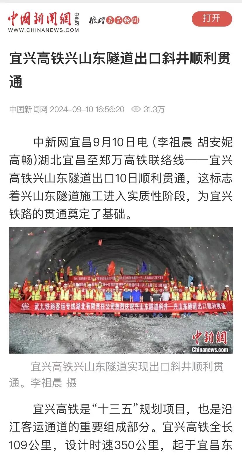 9月10日,由中铁隧道局施工的宜兴高铁兴山东隧道出口顺利贯通,为宜兴铁路的贯通奠定了基础。中国新闻网对此聚焦报道。