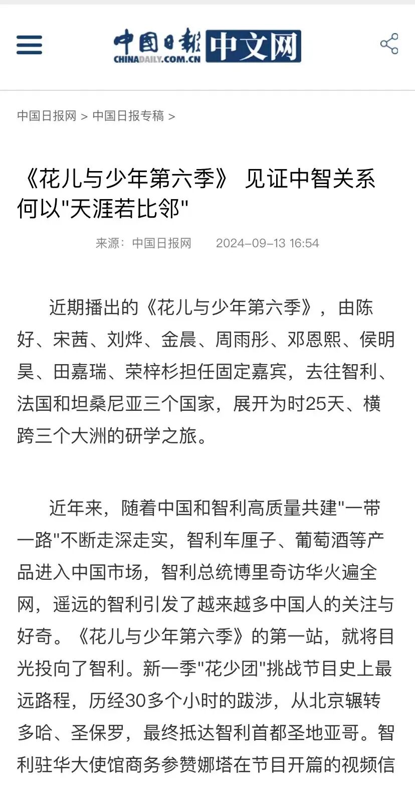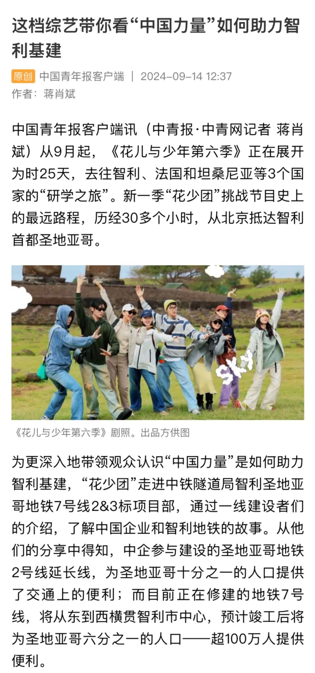 随着中国和智利高质量共建"一带一路"不断走深走实,近日,芒果TV综艺《花儿与少年第六季》的第一站来到智利。"花少团"走进中铁隧道局智利圣地亚哥地铁7号线2&3标项目部,领略"中国力量"如何助力智利基建。中国日报、中国青年报对此聚焦报道。