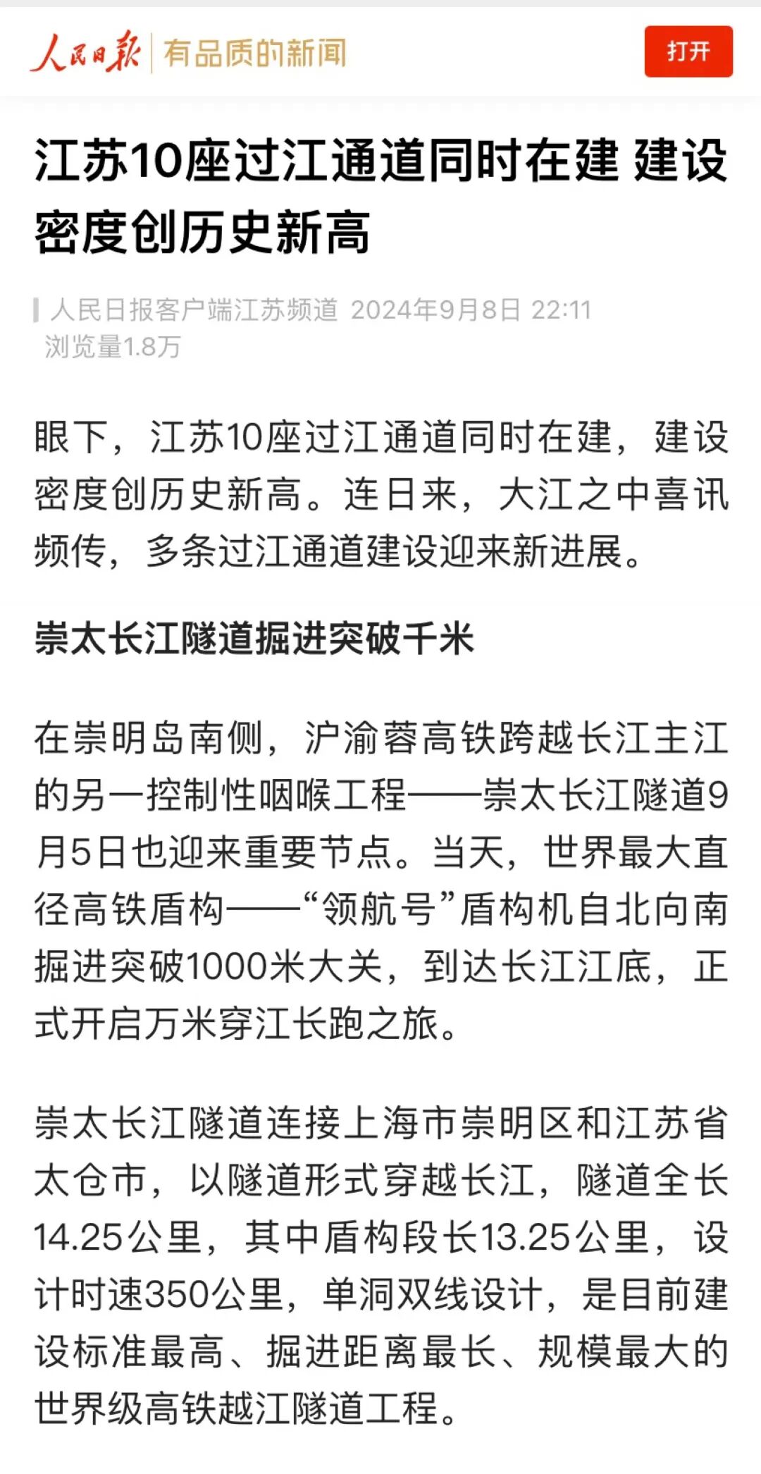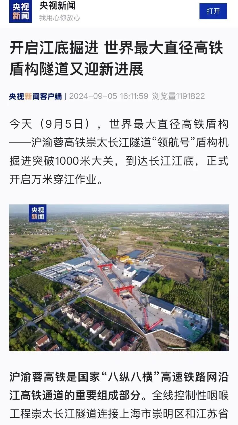 9月5日,崇太长江隧道迎来重要节点。世界最大直径高铁盾构——“领航号”盾构机自北向南掘进突破1000米大关,到达长江江底,正式开启万米穿江长跑之旅。人民日报、中央广播电视总台对此聚焦报道。