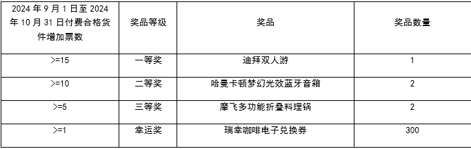 2024年9月1日至2024年10月31日付费合格货件增加票数>=15