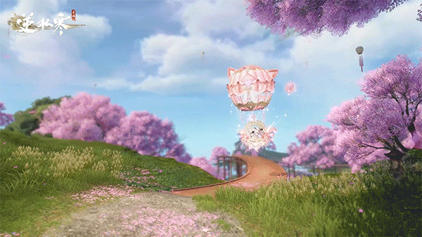 灵喵飘渺游云阙,暖风吹梦正良辰。全新祥瑞【飘喵萦梦】则以粉色为主,为大家编制出一个美好空中花园。吊篮处盛开着粉色的花朵与紫色的藤叶,乘坐其间宛如重回春日!