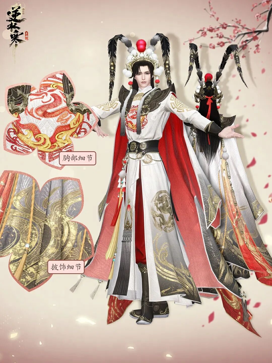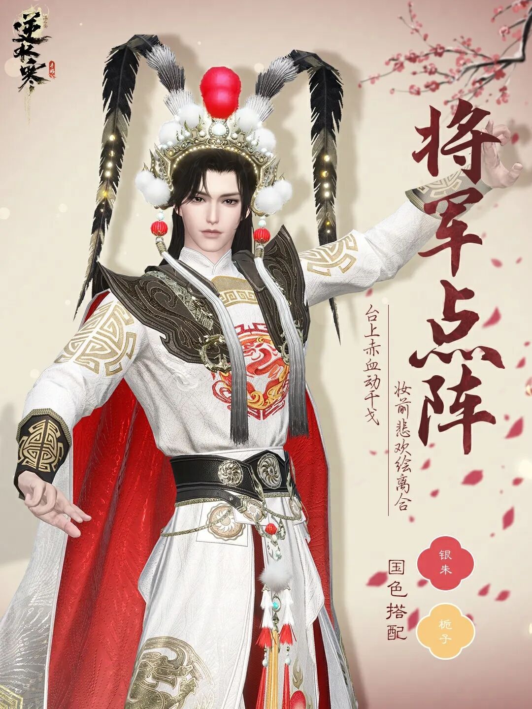 台上赤血动干戈,妆前悲欢绘离合。男款时装【将军点阵】选用优质厚实的布料,绣以祥云、火焰等传统花样纹理,十分精巧。头顶佩戴的将军头盔点缀着红色与白色的绒球,极具经典戏曲风格;身后飘然跃动的披风威武飒气,更显大将之风!