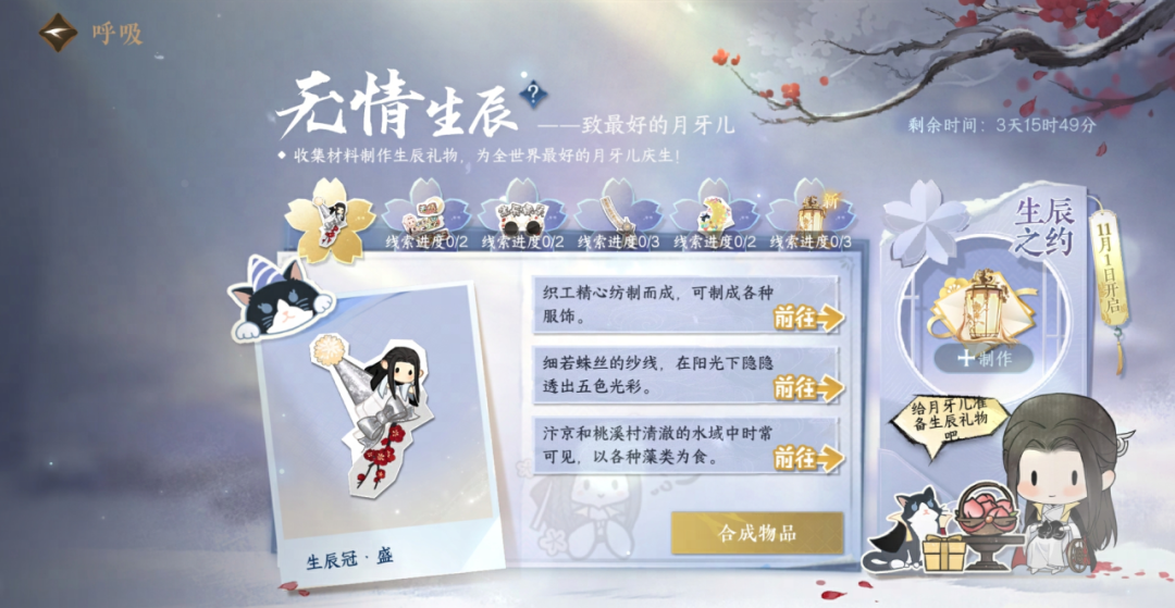 10月25日当天,无情的生辰活动正式拉开序幕!六种生日道具将会逐日登场,各位同门可以根据相关线索或页面提示去合成!