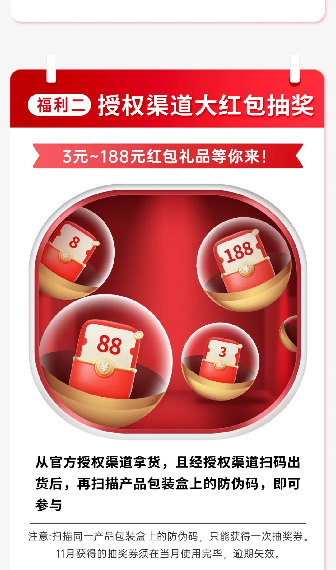 从官方授权渠道拿货,且经授权渠道扫码出货后,再扫描产品包装盒上的防伪码,即可参与。