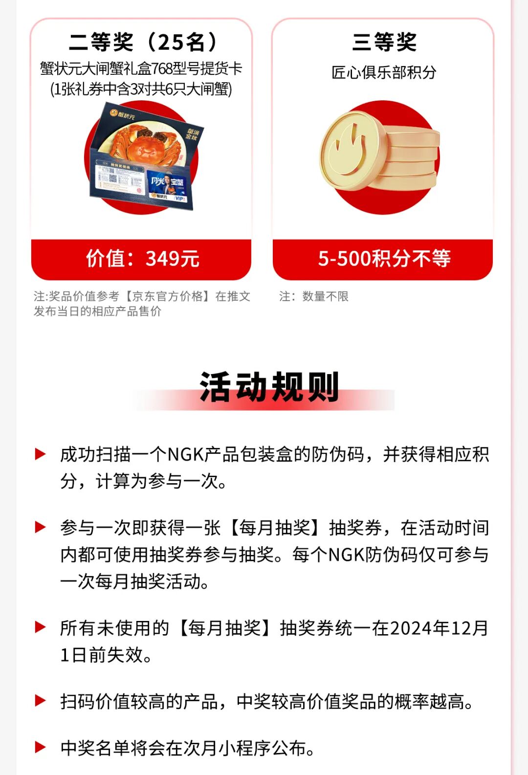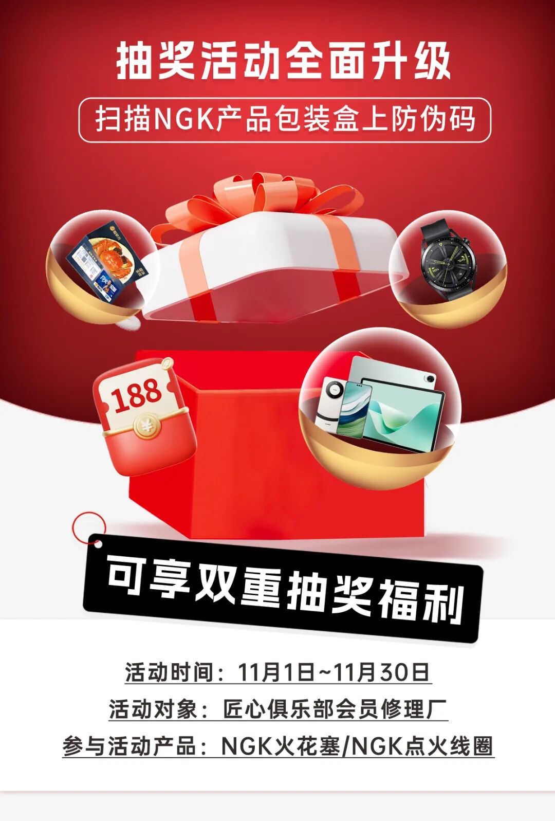 好物厚礼,待您领取。NGK匠心俱乐部11月抽奖活动正式开启,扫描NGK产品包装盒上防伪码,可享双重抽奖福利。活动时间:2024年11月1日-30日;活动对象:匠心俱乐部会员修理厂;参与活动产品:NGK火花塞/NGK点火线圈。