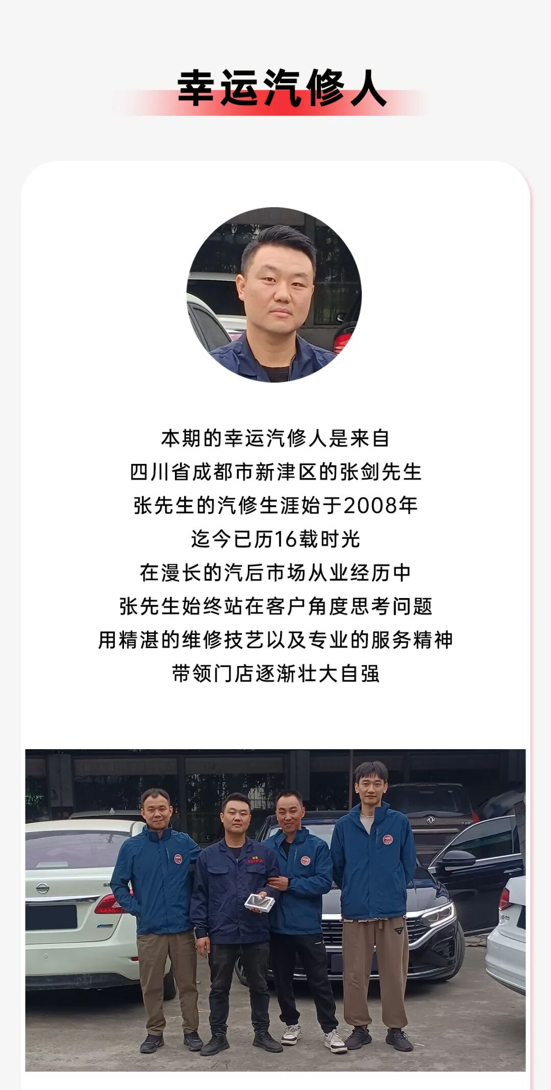 本期的幸运汽修人是来自四川省成都市新津区的张剑先生,张先生的汽修生涯始于2008年,迄今已历16载时光。在漫长的汽后市场从业经历中,张先生始终站在客户角度思考问题,用精湛的维修技艺以及专业的服务精神,带领门店逐渐壮大自强。