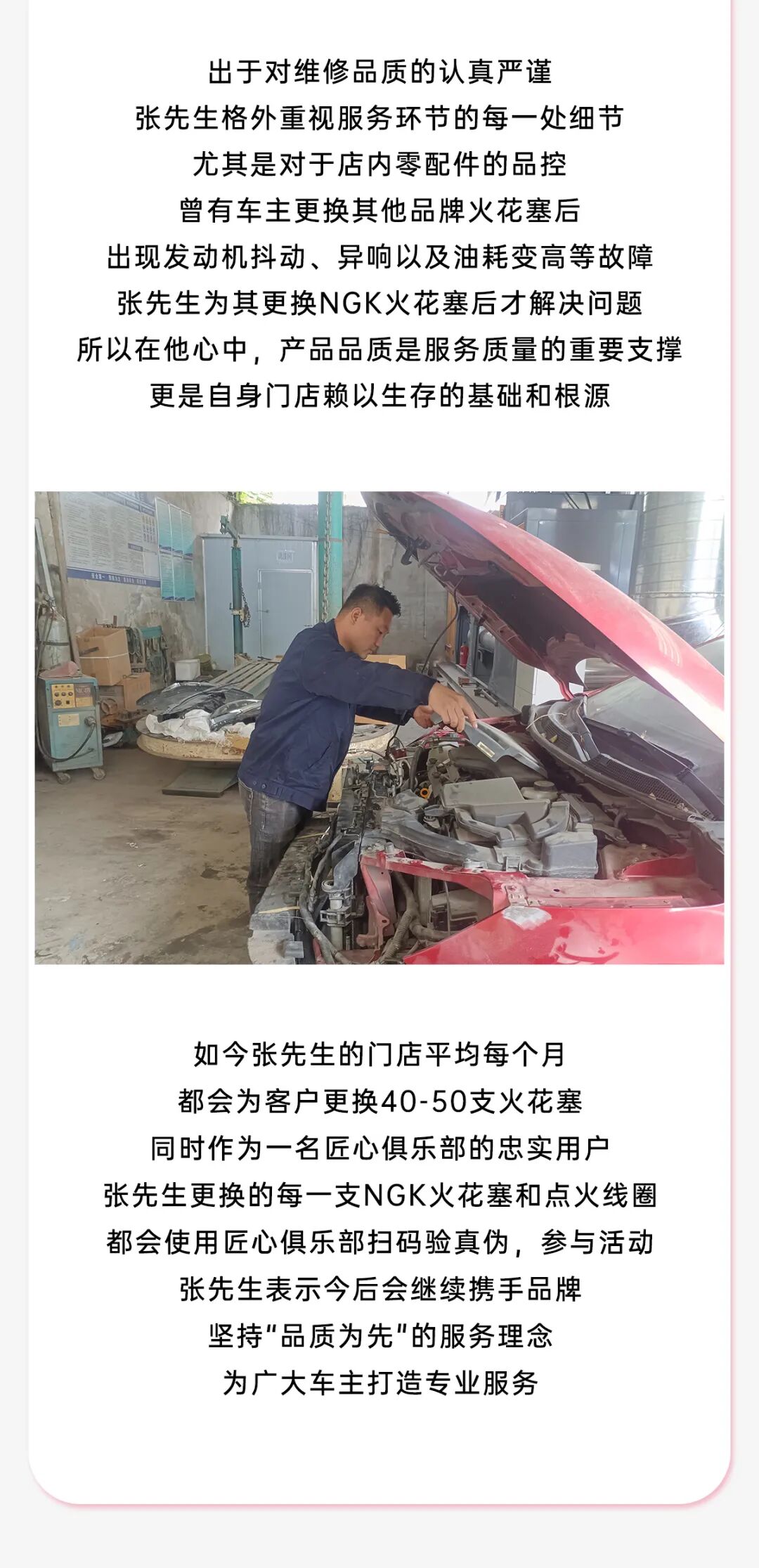 如今张先生的门店平均每个月都会为客户更换40-50支火花塞,同时作为一名匠心俱乐部的忠实用户,张先生更换的每一支NGK火花塞和点火线圈,都会使用匠心俱乐部扫码验真伪,参与活动。张先生表示,今后会继续携手品牌,坚持“品质为先”的服务理念,为广大车主打造专业服务。