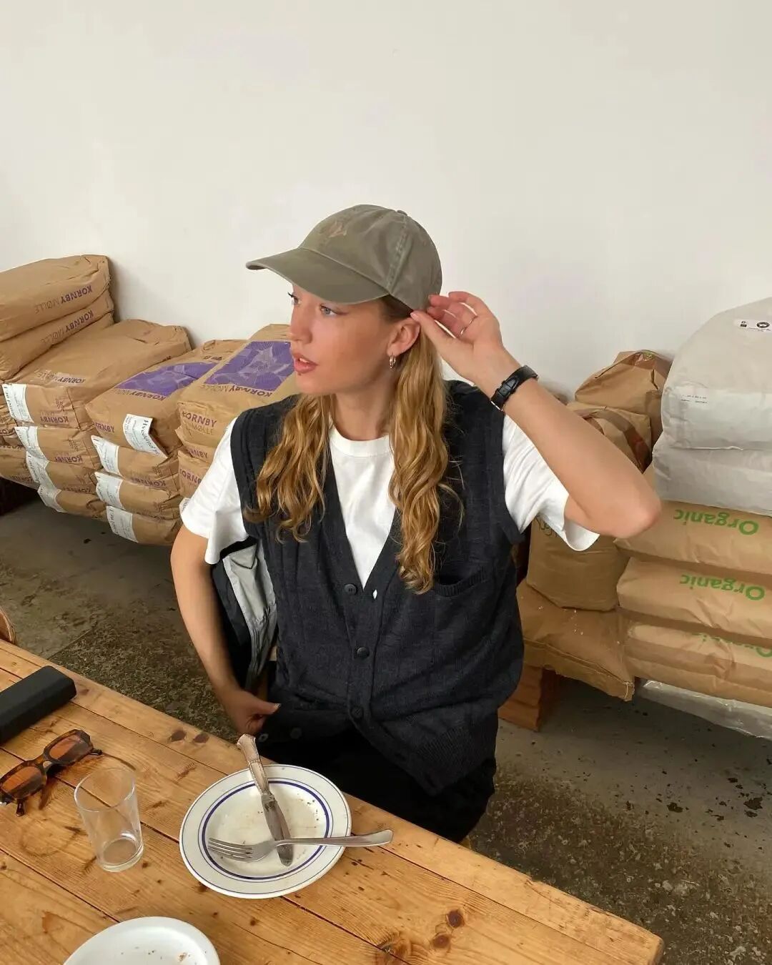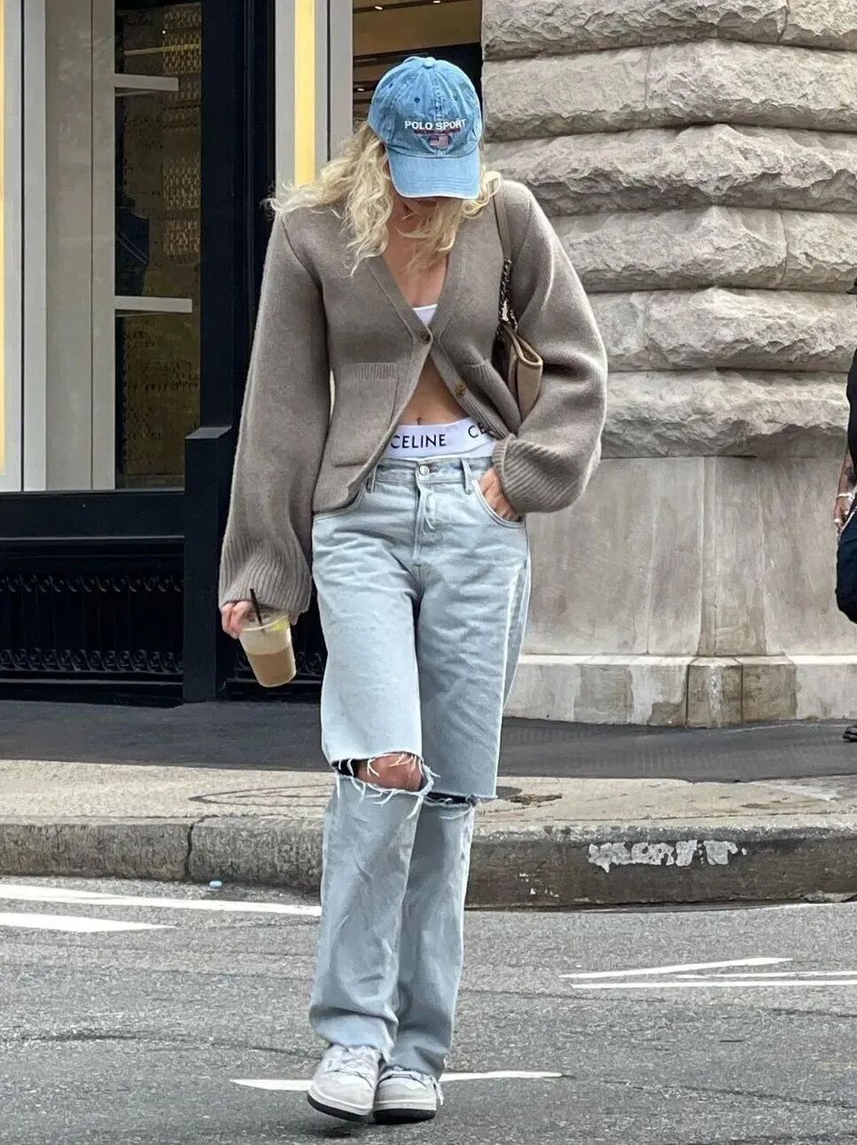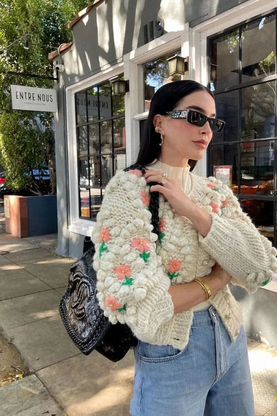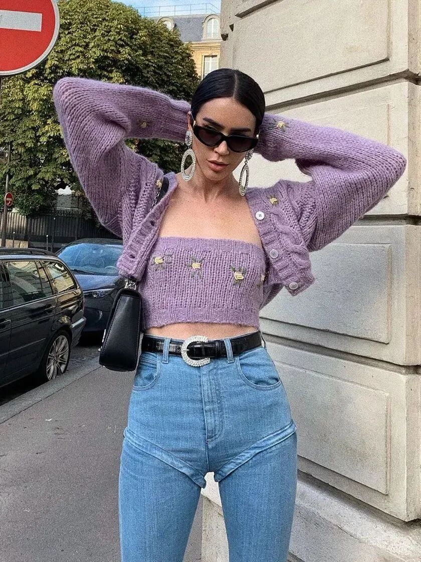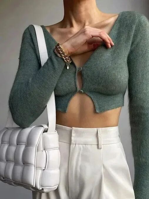 另一种紧身开衫的穿法要更适合当下的气候,凹完造型后还能扣上纽扣保持温度。