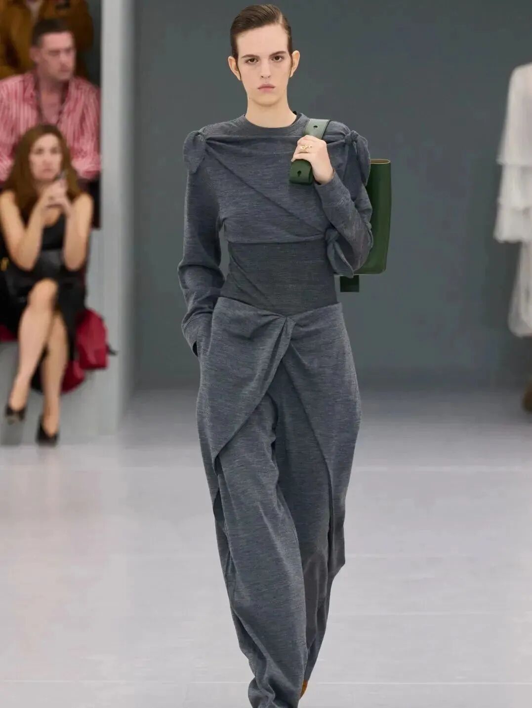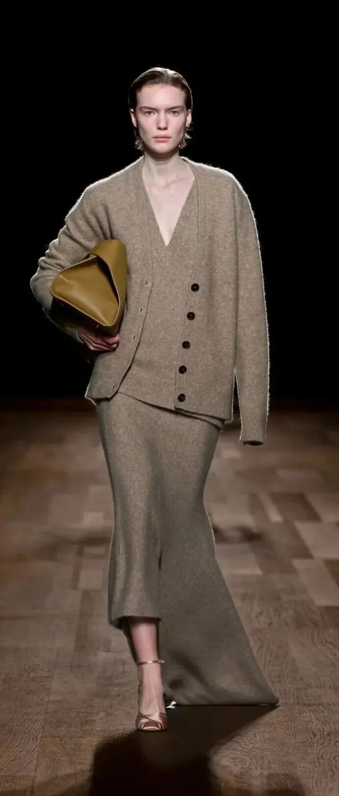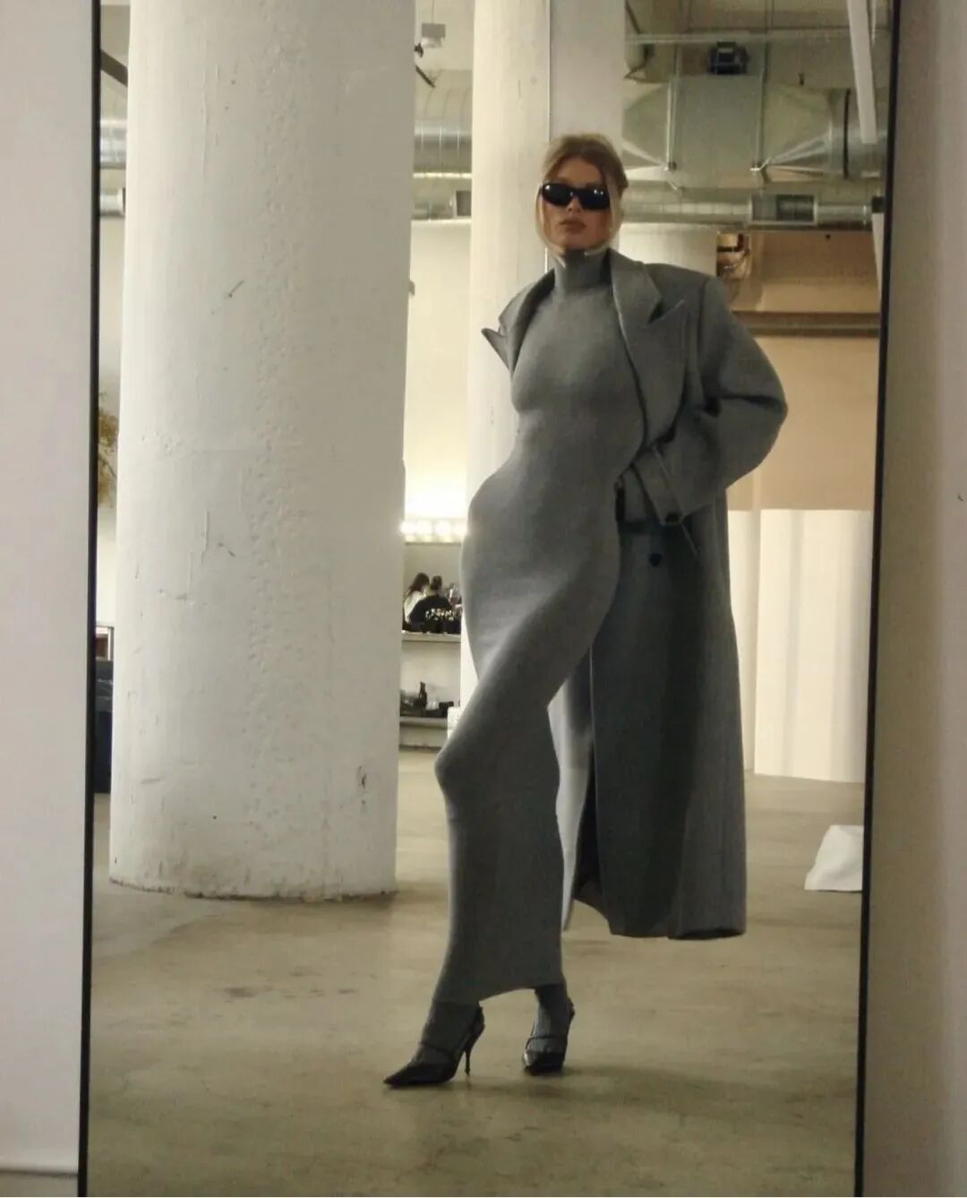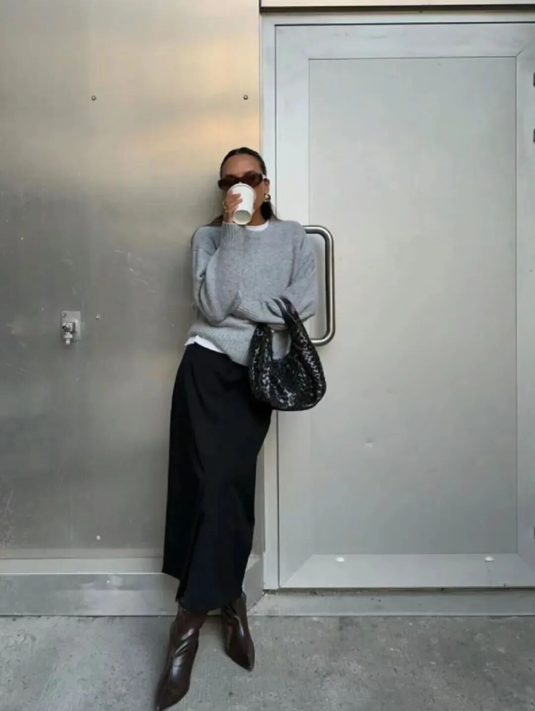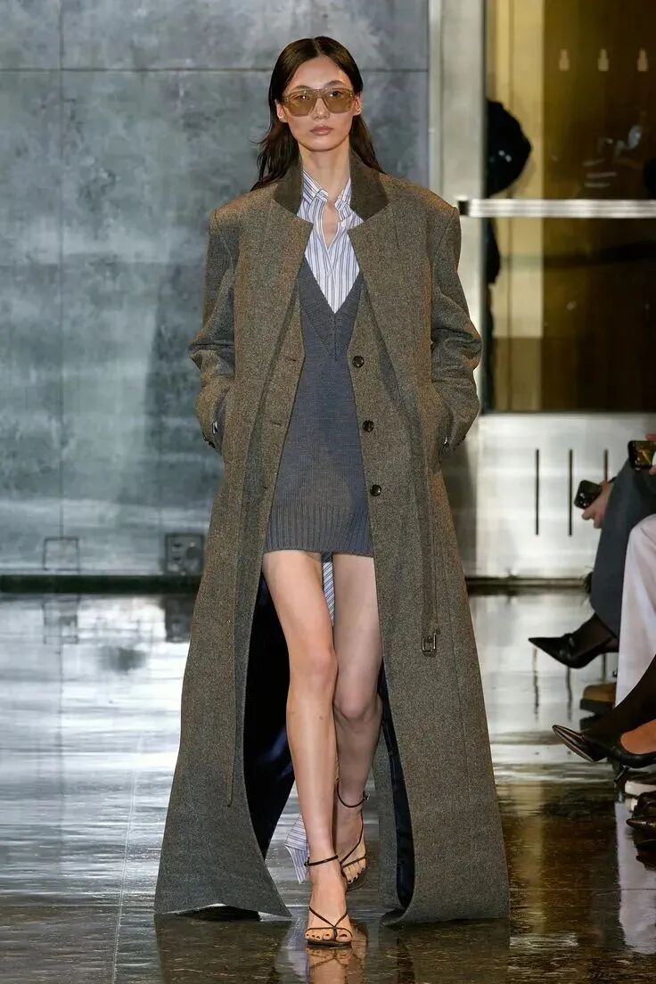 裙装亦能在灰色调造型中吸睛满满,技巧是“内紧外松”,用紧身的针织长裙塑造出性感的包裹感,再叠一件松松垮垮的披肩或是硬挺大衣,立马营造出大女人气场。