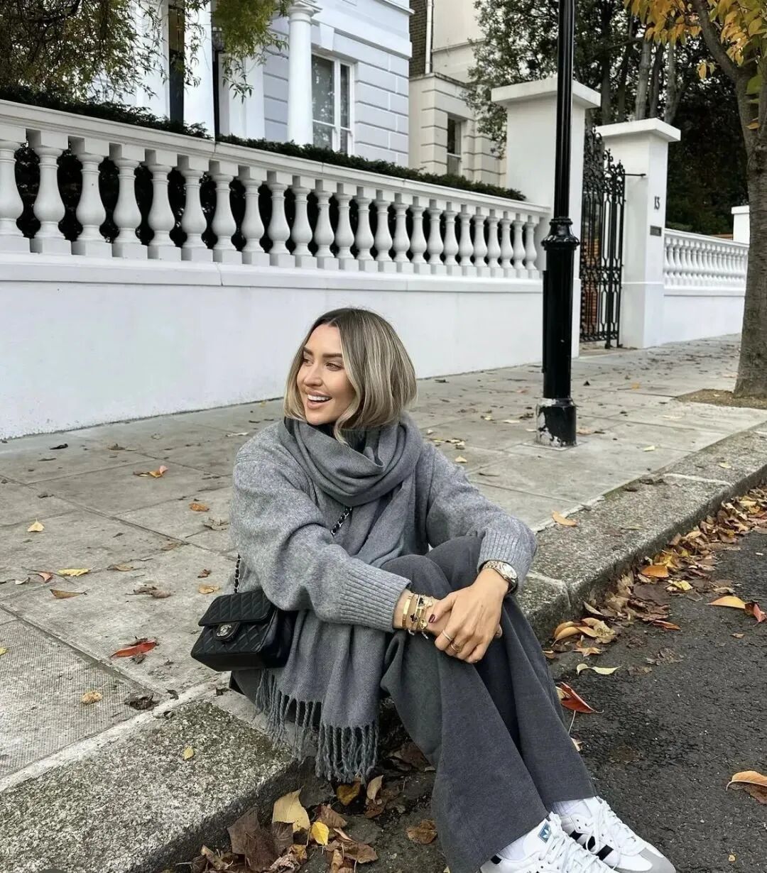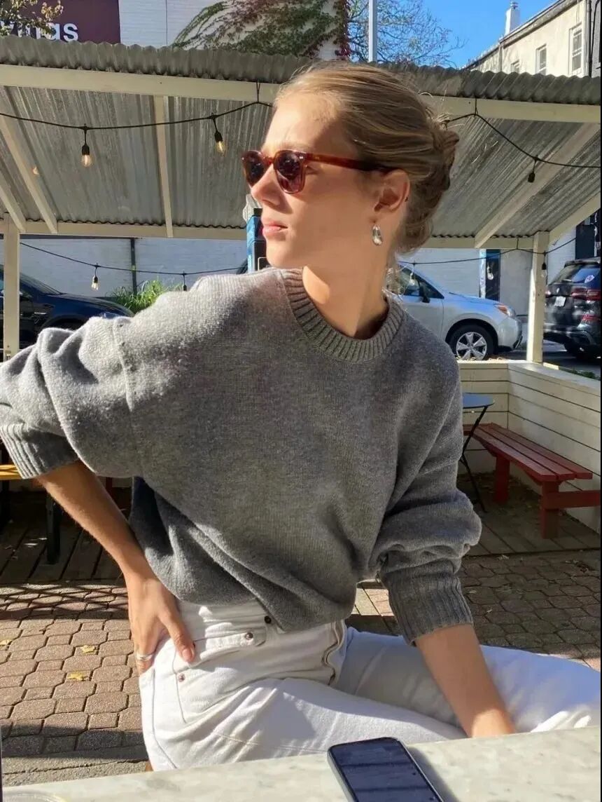 对于想要浅尝知识分子风格,又不想要显得太呆板的姐妹来说,灰色系针织衫搭配裤装是永远也不会过时的随性组合。