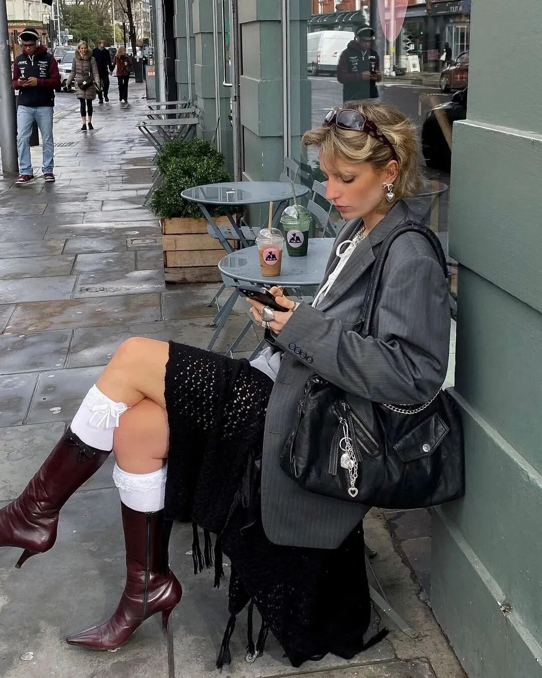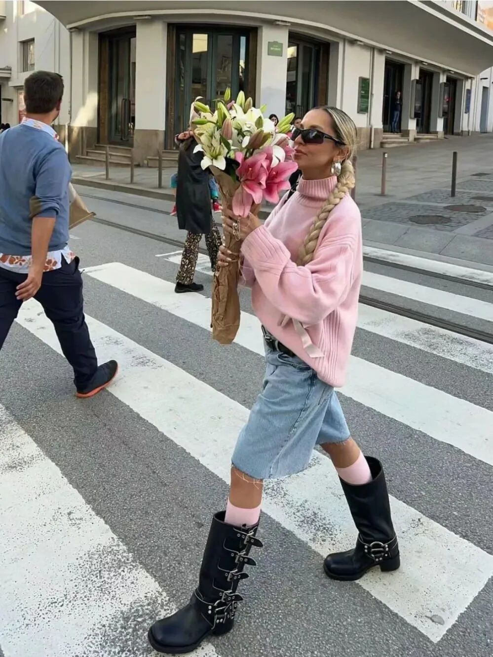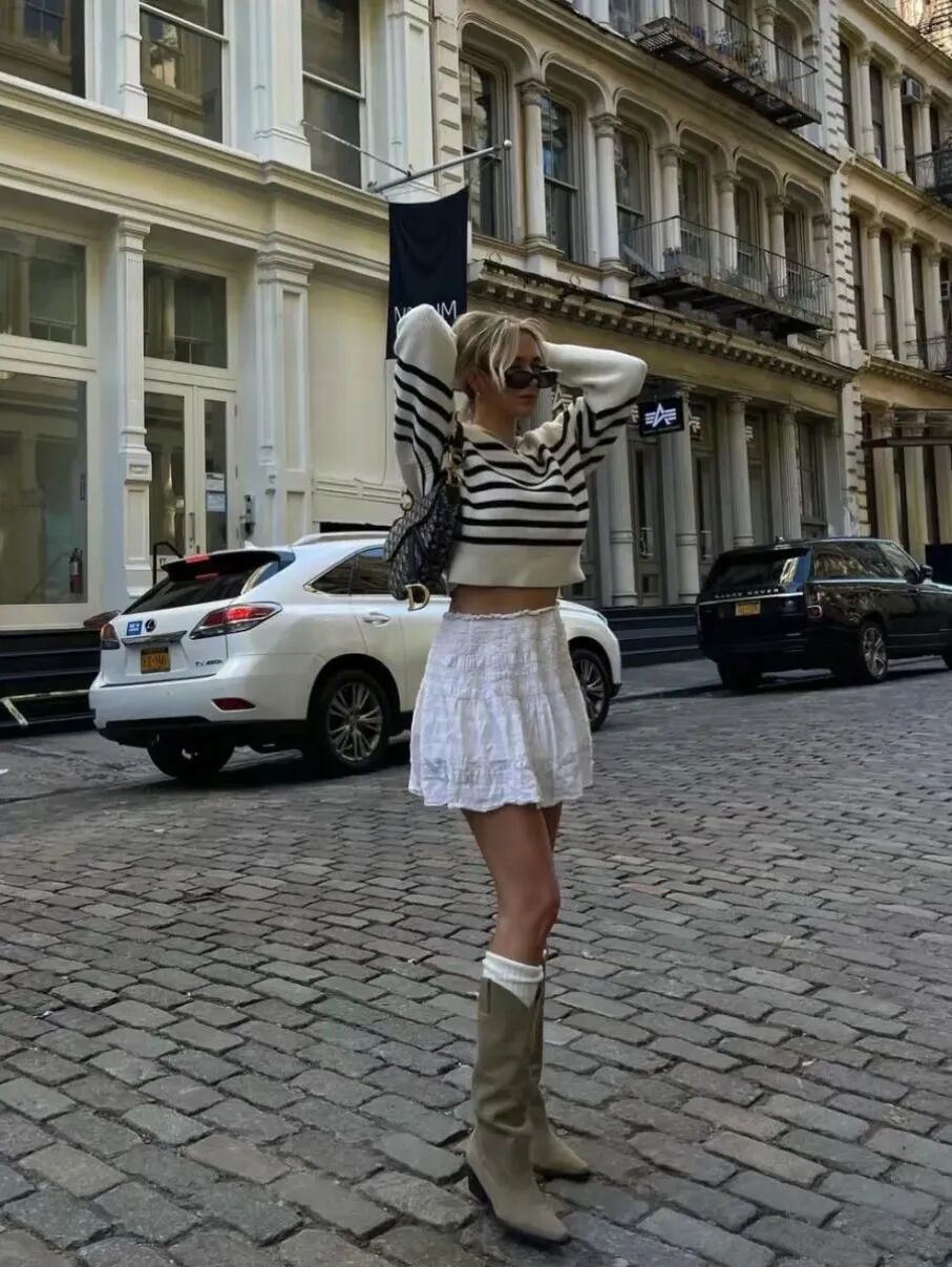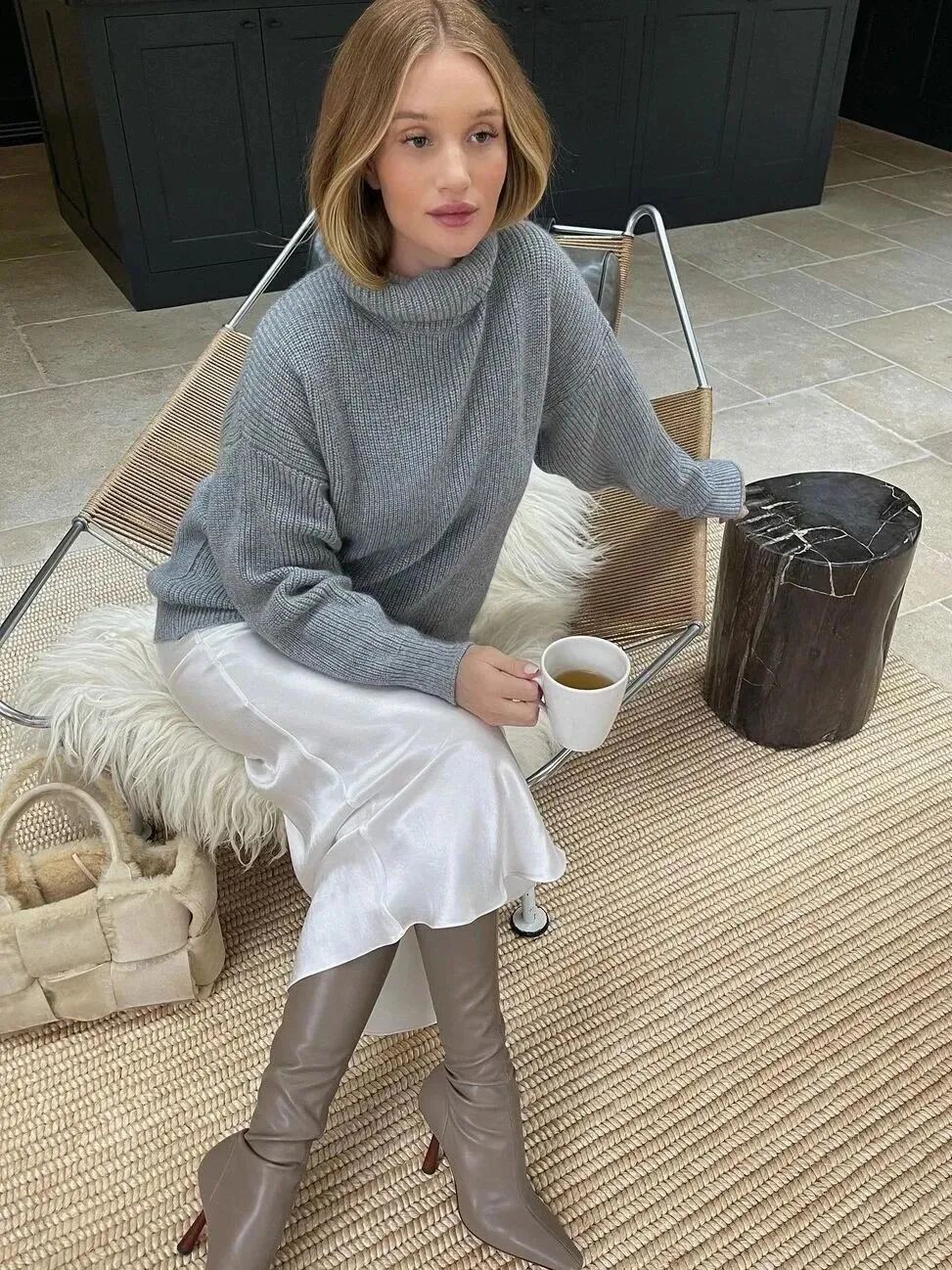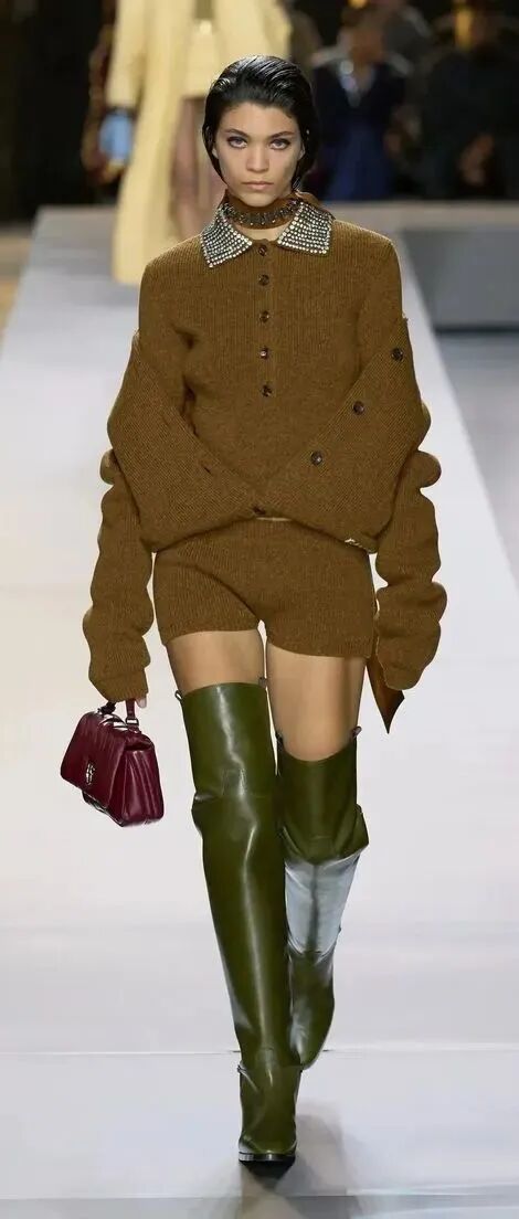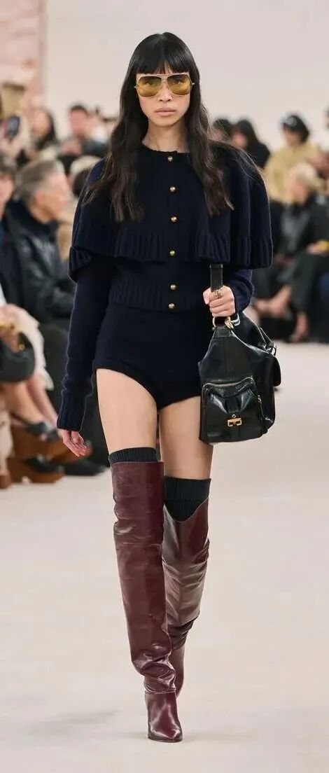 此外,还可以在鞋履处下功夫,用厚重的骑士靴搭配针织造型,兼具温柔与酷飒格调。