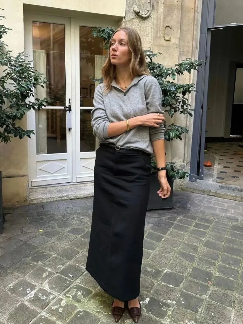 若是喜欢更加松弛不紧绷的造型,那么用灰色针织衫搭配半裙,特别需要注意面料的选择不宜太过抢眼,经典的绸缎与西装面料都很时髦。