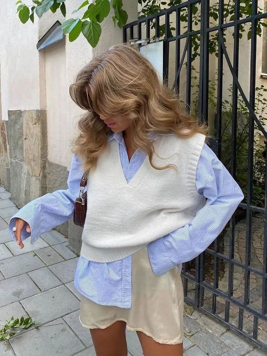 针织马甲比想象的还要实穿主义,凉爽的当下可以用衬衣与短袖T作为内搭,等到降温后,还可以叠加高龄毛衣、西装外套等单品。