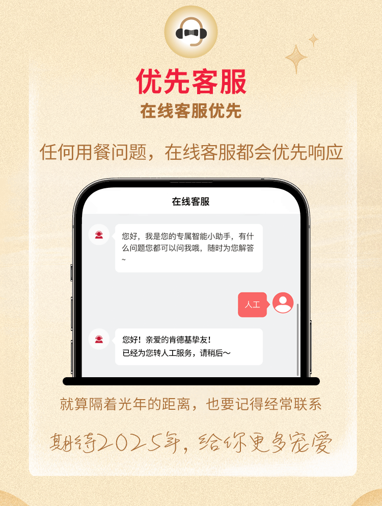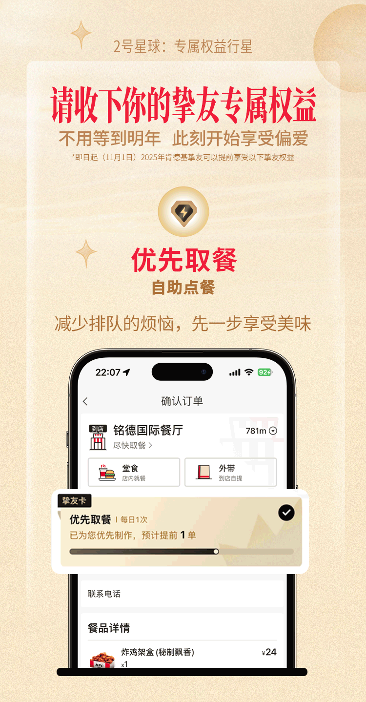 肯德基付费会员登录后,优先取餐权益可在自助点餐点餐过程中直接使用。优先客服权益在挚友卡主题页点击“优先客服”或在自助点餐和肯德基宅急送订餐时,点击客服头像即可享受优先客服通道。