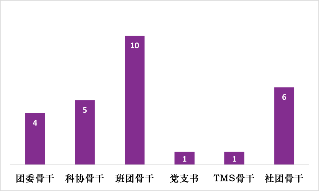 15位候选人中,4人(曾)担任校/系团委骨干、5人(曾)担任校/系科协骨干、10人(曾)担任班长或团支书、1人(曾)担任党支书、1人(曾)担任系TMS分会骨干、6人(曾)担任学生社团骨干。