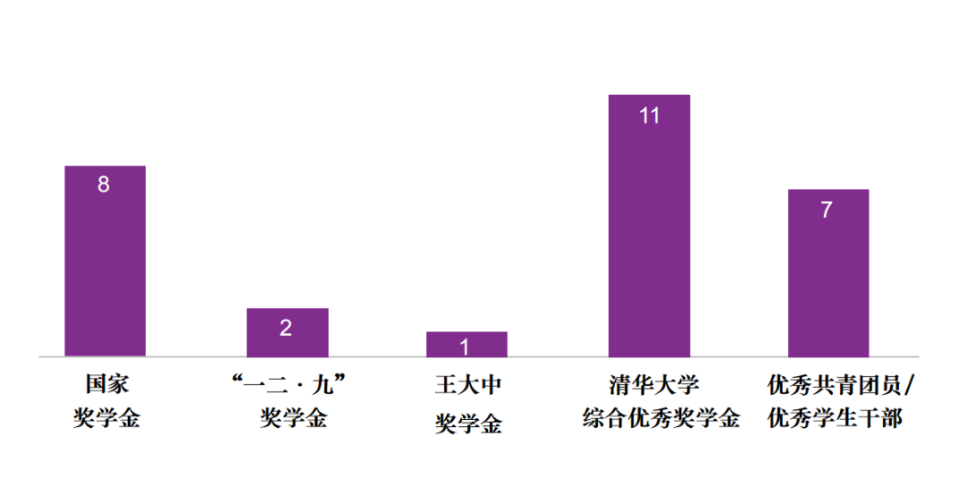 15位候选人中,8人获得国家奖学金、2人获得“一二·九”奖学金、1人获得王大中奖学金、11人获得清华大学综合优秀奖学金,有7人获得清华大学优秀共青团员或优秀学生干部的荣誉称号。