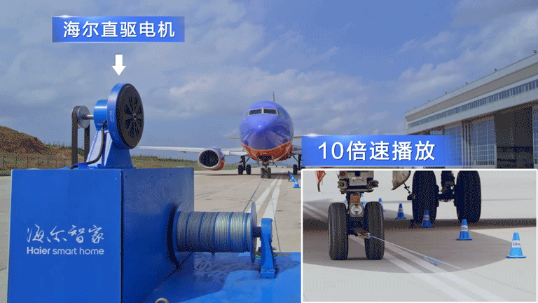 2021年8月,海尔洗衣机以一台7kg重的直驱电机,拉动一架28吨的波音737飞机向前行进40米。