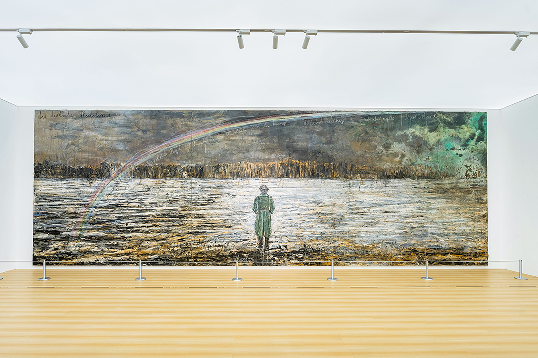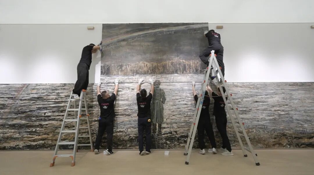 在众多专业的艺术博物馆中,大多使用现代简约风格式照明,它的特点是空间内均匀而冷色调的光线。在「艺起“杰”作」展览中,有一件史诗级巨作——德国艺术家安塞姆·基弗的作品《德国哲学思想家的传承》(Die Deutsche Heilslinie),作品所在展厅就采用了这类灯光设计。为了实现这件巨制作品所产生的视觉震撼效果,以及力主还原作品的肌理与细节,灯光师们在天花内侧安装大面积的发光天棚,均匀地洗亮房间,大面积的照明使观众长时间观看也不会用眼疲劳,能够清晰地看到作品的每个细节。