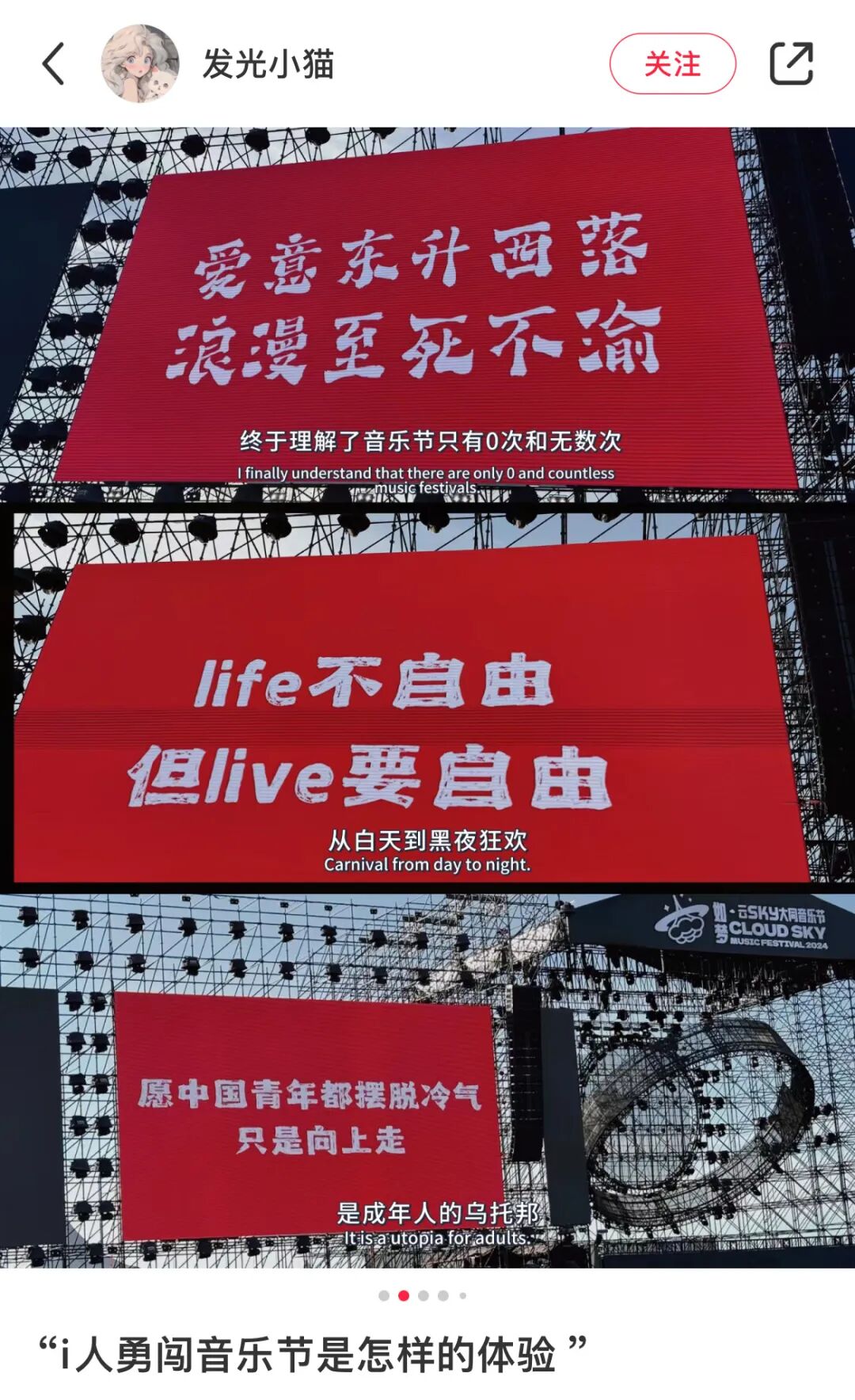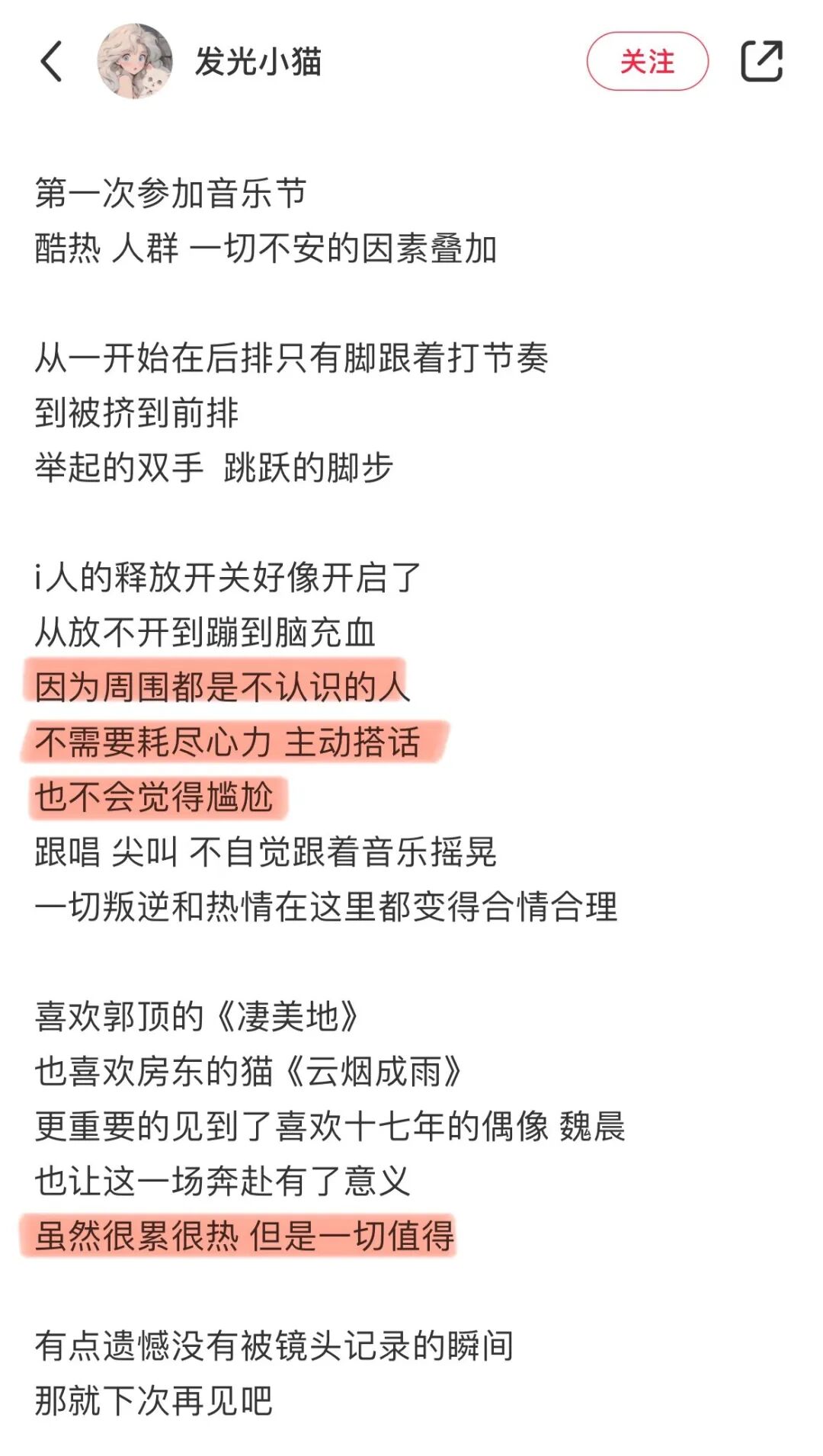 @发光小猫 i人勇闯音乐节,和一群一样喜欢音乐的陌生人一起,打开了TA的释放开关,在草地上肆意蹦跳。在其他拥挤的人潮中可能会无所适从,但和兴趣相投的朋友一起就很幸福!