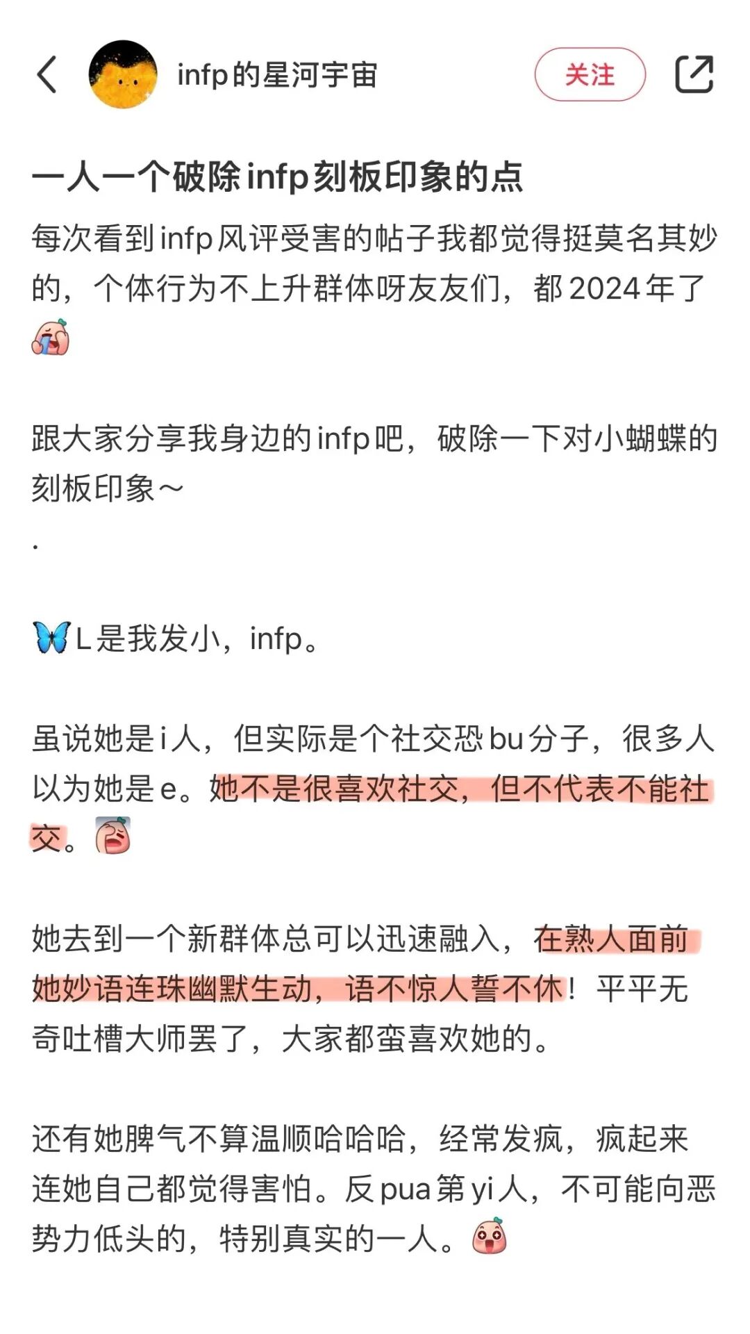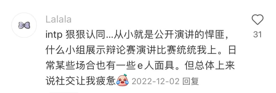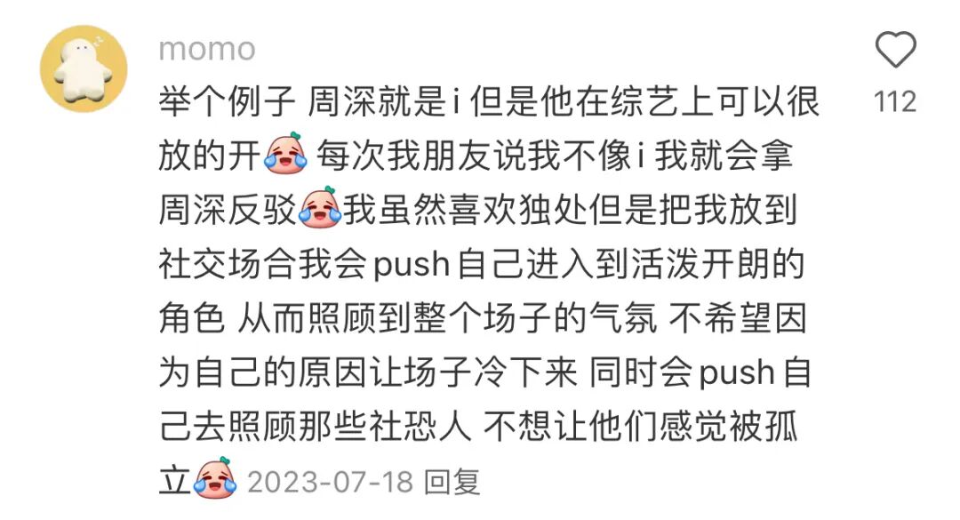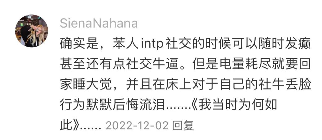 “高阶”的i人常常以e的形态出现在社交场合中,@momo 因为害怕尴尬和冷场所以会主动承担活跃气氛的任务,为i变e,让自己显得游刃有余,其实是防止自己精神内耗的方式。