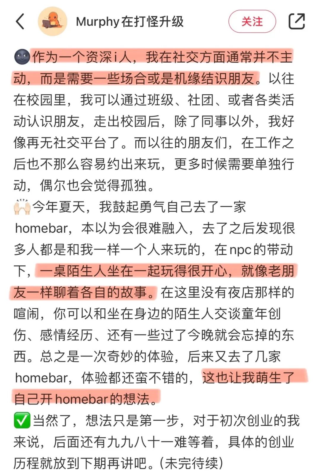 就像第一次体验homebar的i人@大中华john 说:“在homebar就像去朋友家玩一样随意,可以放松地和陌生人交谈、认识新朋友,原来i人社交也可以chill成这样啊!”