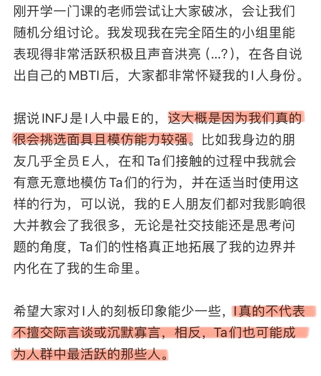 @起雾蓝莓 因为在完全陌生的小组讨论中表现得非常积极且声音洪亮,被严重质疑i人身份,冤枉啊,这只是我的E人面具。