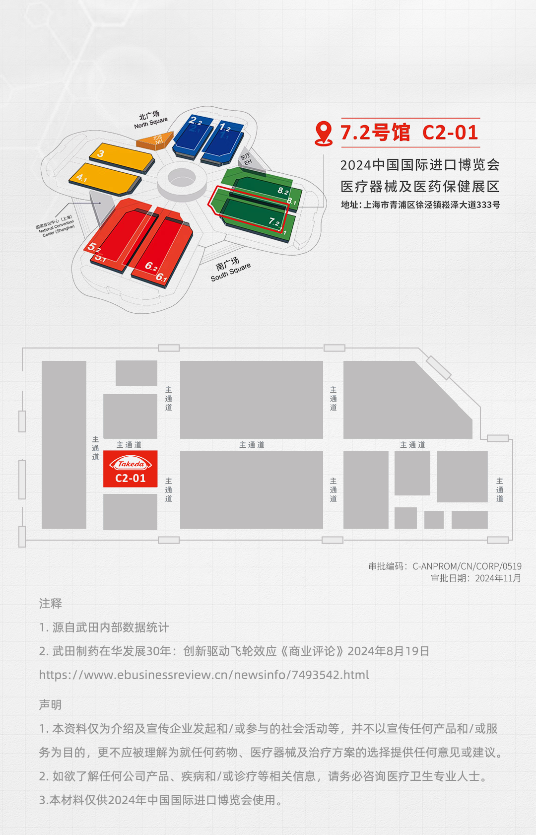 武田制药(东京证券交易所股票代码:4502)(纽约证券交易所股票代码:TAK)是一家总部位于日本、以价值观为基础、以研发为驱动的全球生物制药公司。武田致力于将科学研发成果转化为高度创新药品,为患者的健康生活和美好未来保驾护航。武田专注于四大治疗领域的药物研发:肿瘤、消化、神经科学及罕见病领域,并针对血液制品及疫苗领域进行专项研发投入。我们始终专注于高度创新药物的研发,通过开拓全新治疗方案、增强合作研发引擎实力,打造一条稳健且形式多样的产品管线,助力改善人们的生活。我们的员工遍布于大约80个国家和地区,与当地医疗健康合作伙伴携手,为全球患者带来健康福音。
