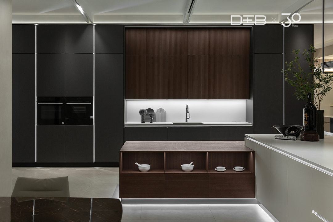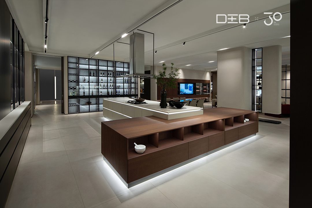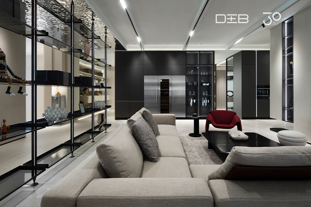 朗阔的空间中,不同的展品如画卷般横向铺展叙事,产品如同画中的绝妙笔触,每一个落点都恰到好处。展厅中央的客厅和餐厨空间形成一个整体,尺度奢阔,和谐统一,但又不失个体的独特魅力。