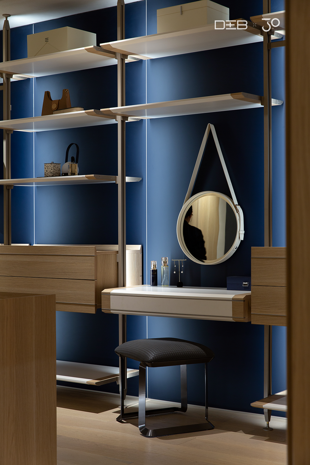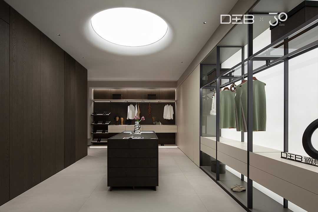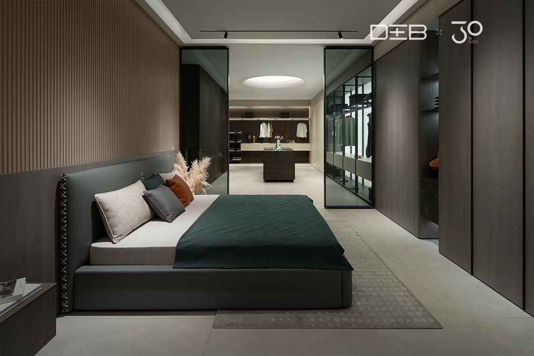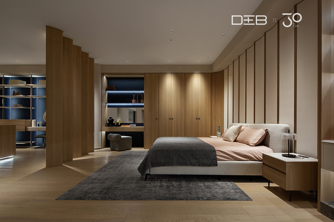 侧面舒敞的卧室空间,以现代生活图景为蓝本,集合了睡眠、更衣、收纳、盥洗等功能,全面展现德贝四大系统产品在空间不同场景中的应用和丰富的功能体验。