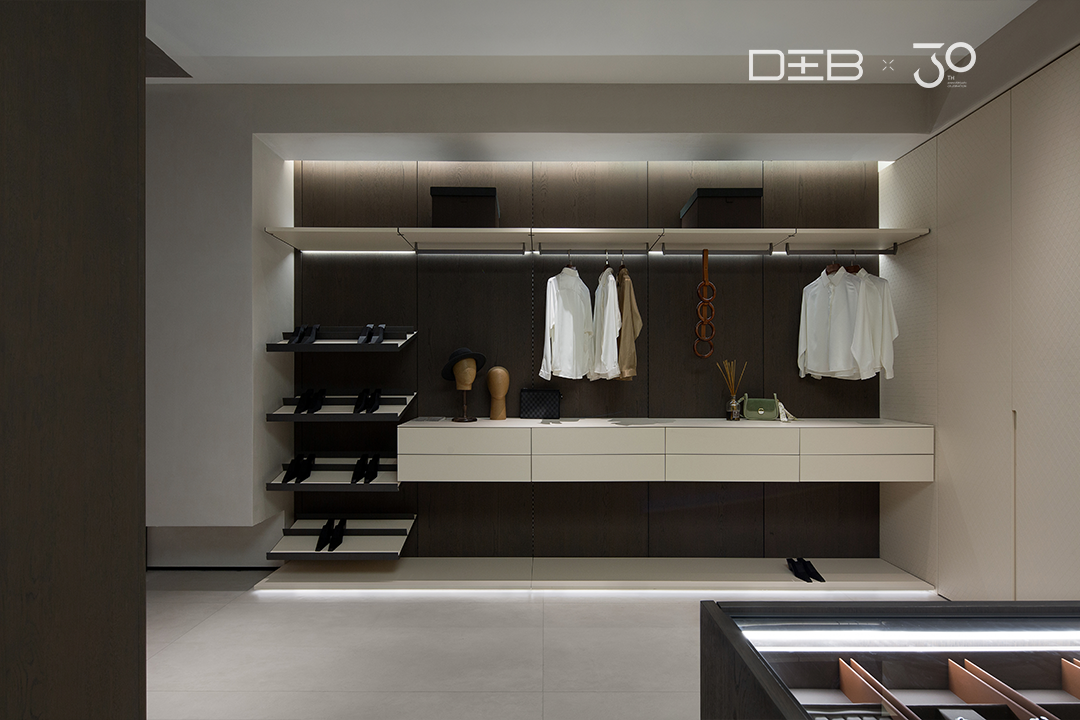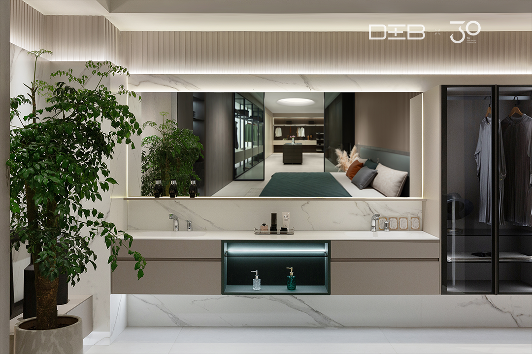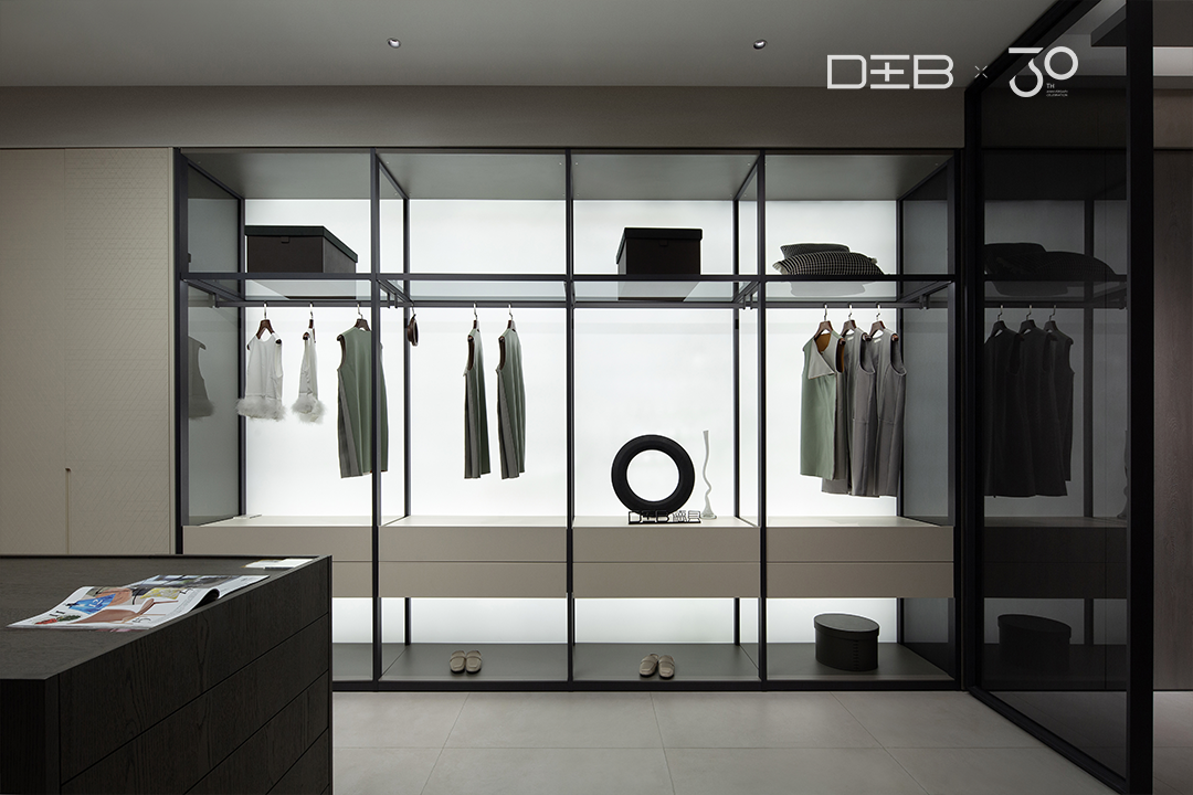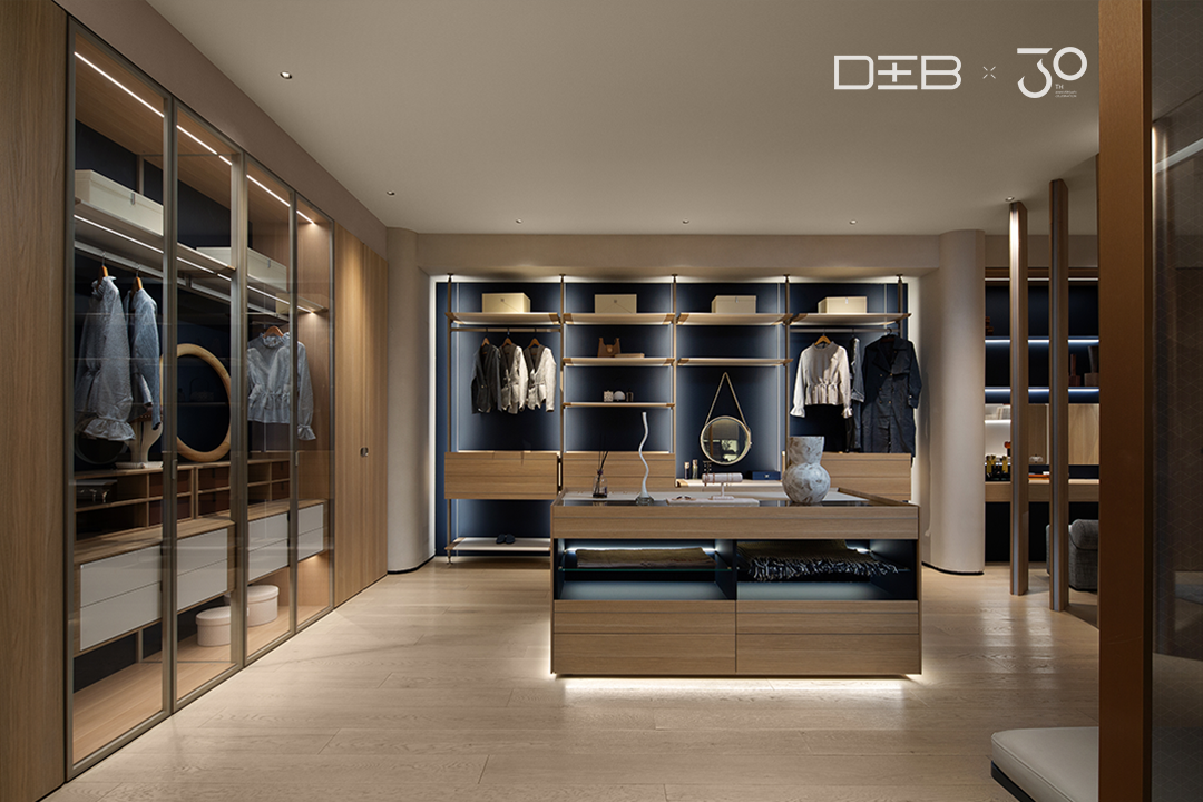 侧面舒敞的卧室空间,以现代生活图景为蓝本,集合了睡眠、更衣、收纳、盥洗等功能,全面展现德贝四大系统产品在空间不同场景中的应用和丰富的功能体验。