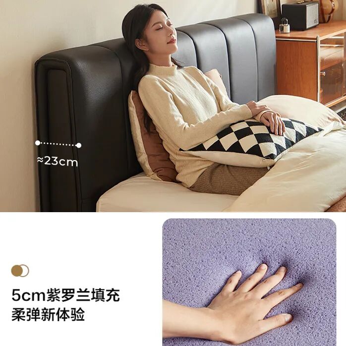 选床嘛!不仅要好看,还要好躺好睡,大荔枝纹真皮靠背手感厚实耐用,再填充5cm加厚紫罗兰释压海绵,从此腰酸背痛飞走走~