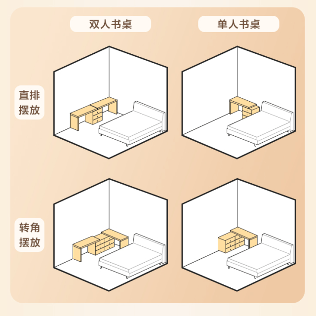 两人住一起老是抢桌子,有这个百变组合书桌完全不用担心!一字形摆放单人书桌变双人桌,办公学习互不打扰。7字形转角摆放更好地利用了床边直角空间,灵活适用各种空间。