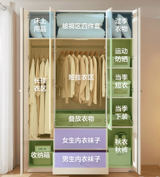 PM1D-A四门衣柜,让衣服能挂着绝不躺着!2.4m一门到顶,被褥区、悬挂区、折叠区、抽屉多区收纳,不管什么衣服,都能放到属于它的位置,打开衣柜一目了然。右边叠放区层板还能拆下来,放收纳箱这样的高身物品也更方便。