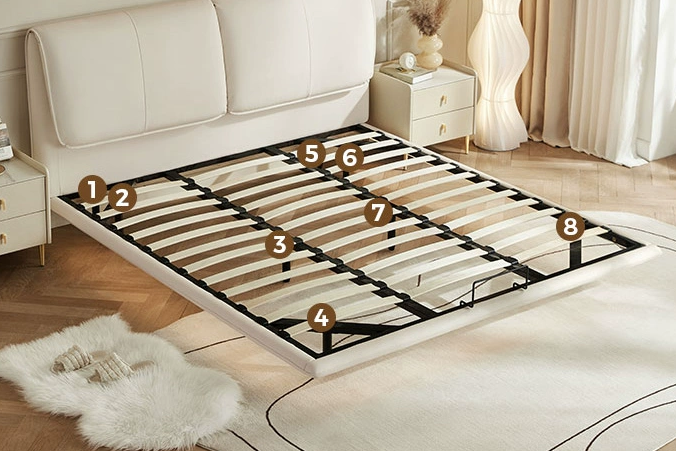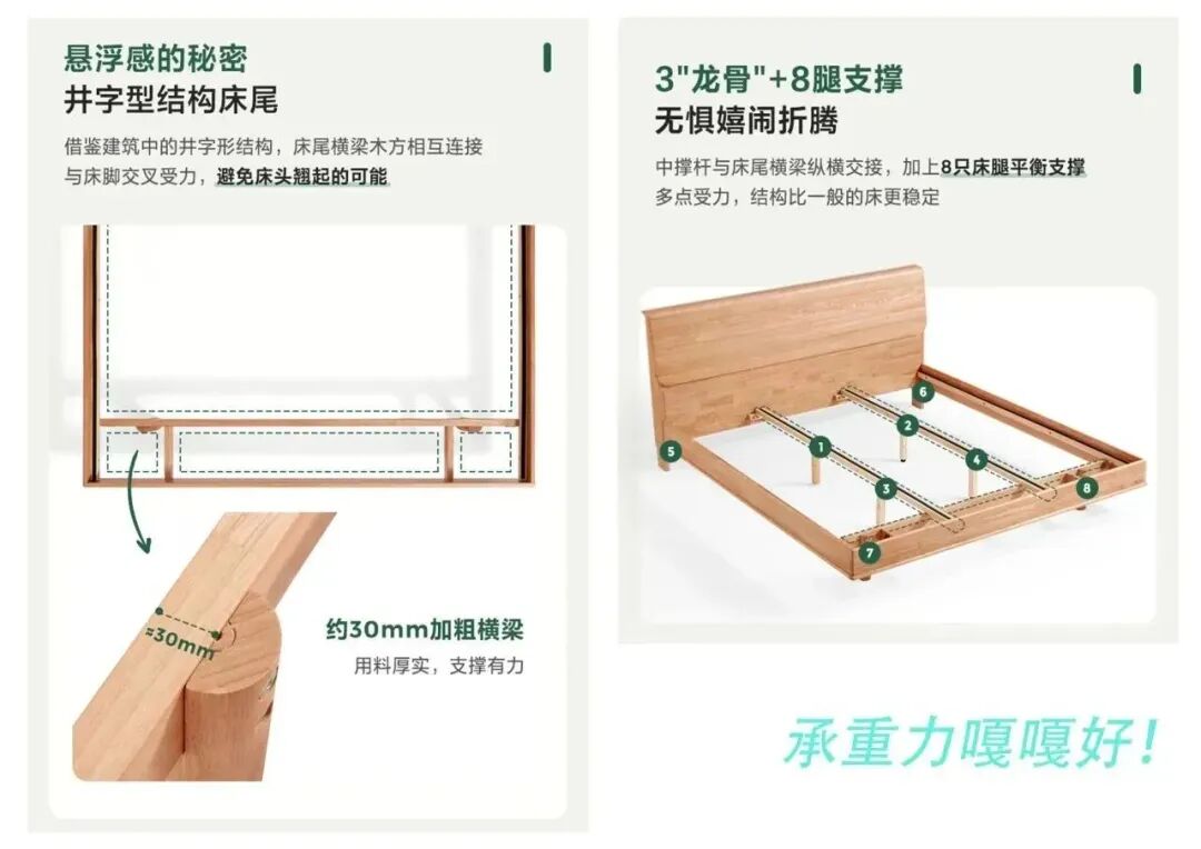 悬浮的秘诀帮你找到了!内收床脚,井字型结构床尾,更加稳固。再加上3“龙骨”+8腿支撑,承重力嘎嘎好,床脚用料足足60mm,是普通床脚的3倍,真不愧是悬浮床中的佼佼者!