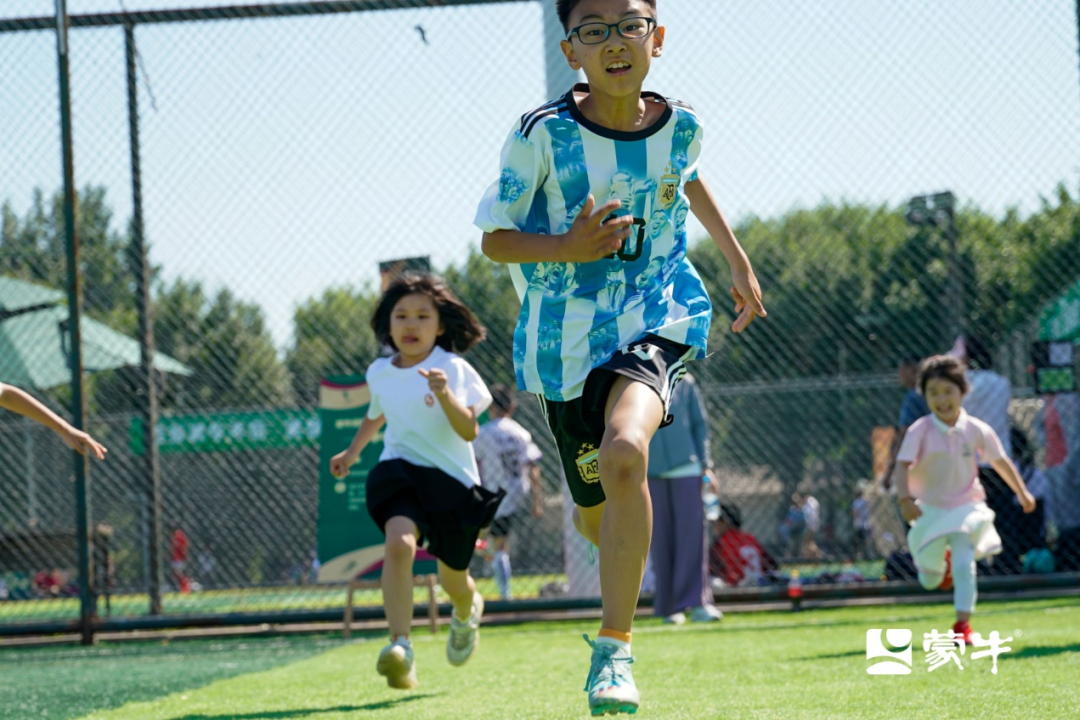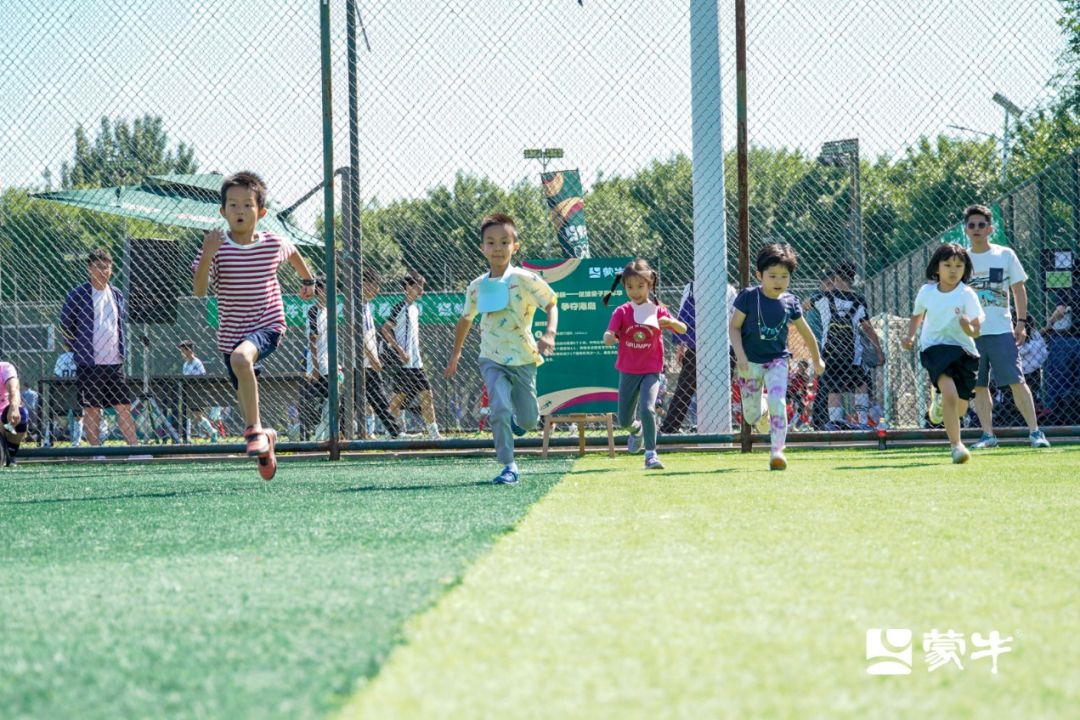 绿茵场上,大人与小孩奔跑的身影,生动地诠释了“更多蒙牛牛奶、更多健康动力”。