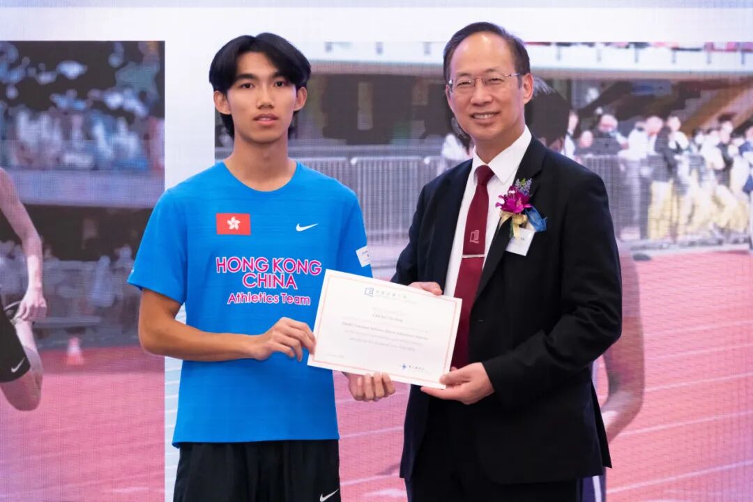 浸大校长卫炳江教授在今天(10月31日)举行的奖学金颁授典礼上,向学生运动员颁发证书。运动员则向卫教授赠送一份巴黎奥运会的特别纪念品,以表谢意。