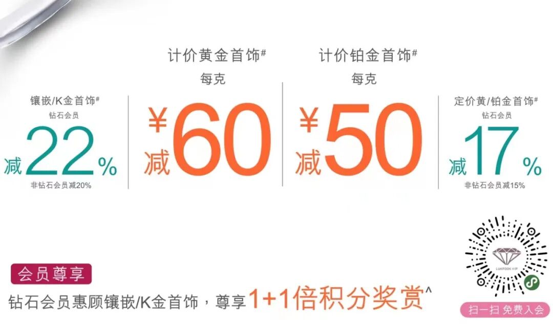 以上优惠仅适用于中国内地之指定六福珠宝门店;以上折扣优惠均以商品标签价格及当天六福珠宝全国统一金价为计价基础,并以每张保证单的实付金额计算;特价、授权精品、电铸摆件、金章、金条及投资金类,不参与上述折扣优惠活动;除会员积分、会员积分抵扣计划外,不可与其他优惠同时使用(如会员恒常折扣、其它活动优惠券、以旧换新等);结账前须出示会员二维码方可参与会员活动、享受会员优惠及累积消费积分,恕不后补;倍赏积分以每张保证单的实付金额计算,不适用于黄/铂金类货品、足金镶嵌货品(如足金和田玉、足金镶钻)等;积分有效期为两年,赠送之积分不可作会籍保留或升级之用,积分使用受条款及细则约束,详情请参阅六福珠宝官网或会员小程序内之「会员计划」;六福集团之员工均不得参与上述会员活动,以示公允;所有优惠及会员尊享礼遇受条款及细则约束;详情请向店员查询;图片仅供参考。