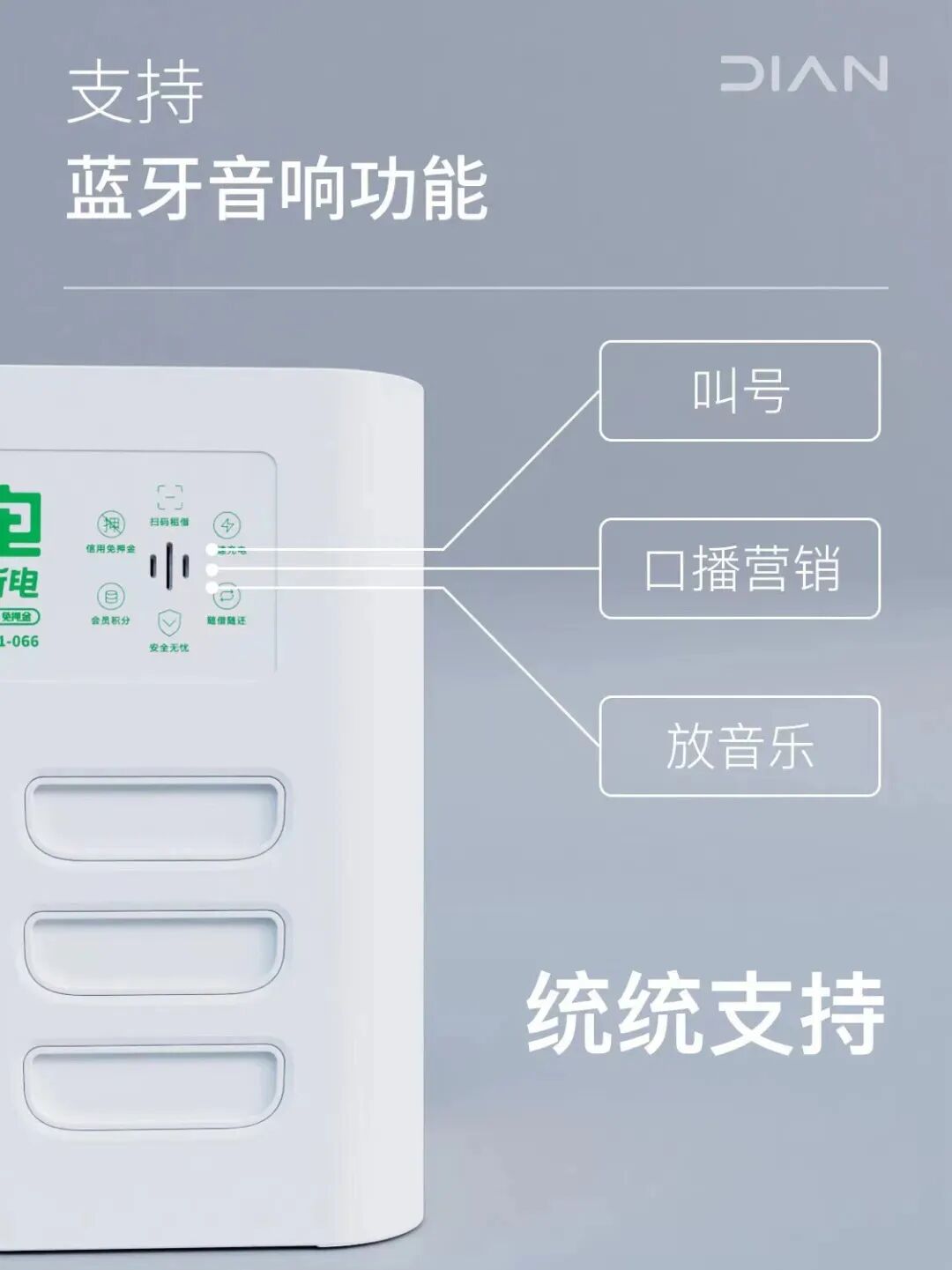 全新6口箱机拥有小巧玲珑的身型,可以灵活地进行同版本设备的拼接,完美适应不同类别商家的放置场景。新增的蓝牙音响功能将成为商家的贴心“小喇叭”,帮助商家完成叫号、口播营销、音乐播放等工作,兼顾共享充电与商家“小助手”功能。