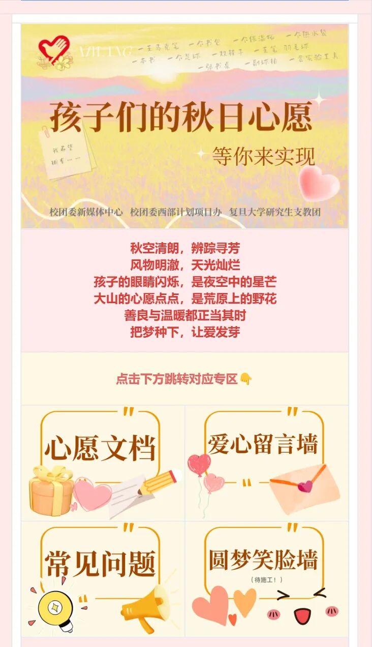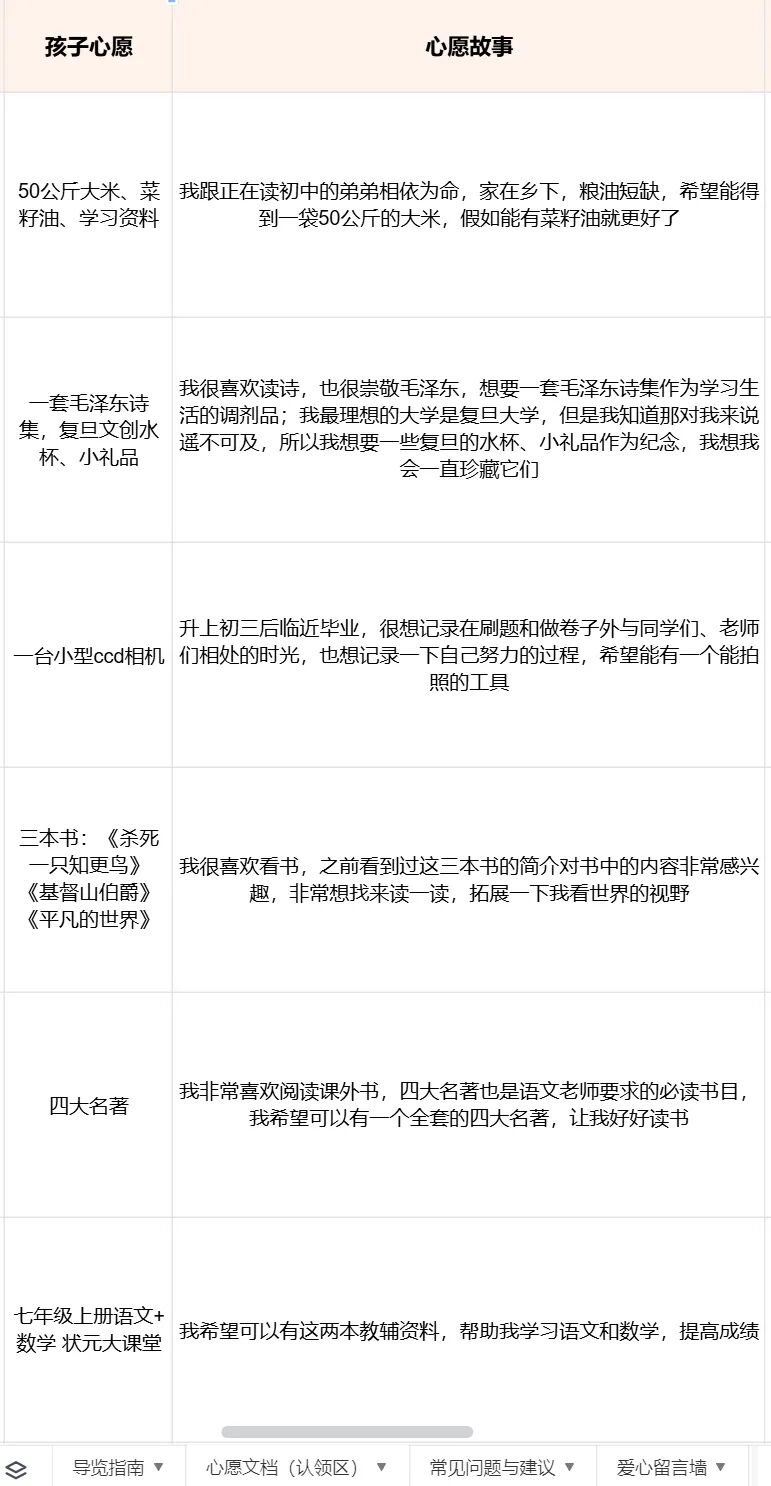 「导览指南」唤起同学们的爱心,引领他们步入一个充满希望的「心愿认领区」,这里呈现着孩子们美好的心愿与纯真的故事。通过「在线表格」收集,让每一位热心参与者都能便捷地参与到这场爱心接力中来,为孩子们的梦想插上翅膀。