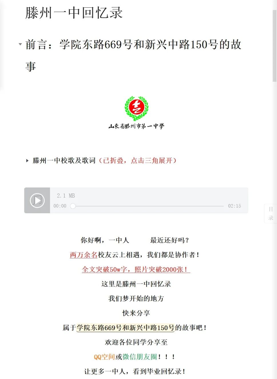 滕州一中使用智能文档制作了一份独属自己母校的回忆录。「回忆录」中插入校歌,将青春的回忆划分成了校园闲聊区、想念老师区、签名墙等多个板块。用「块」来承载同学们的留言;用「图片组」来展示当年的留影。
